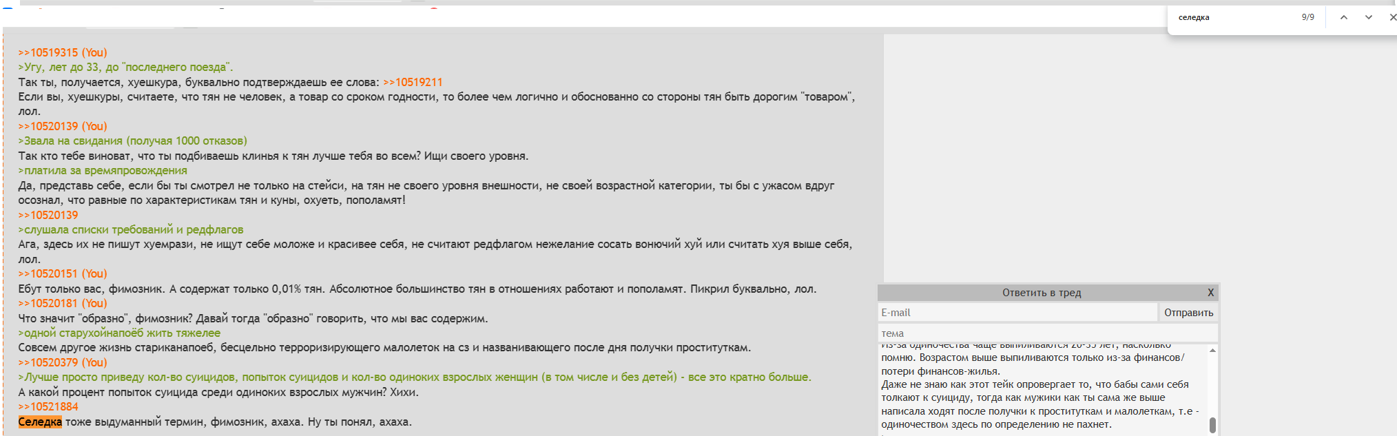 >>10521885 >считаете, что тян не человек Где я это говорил? Смешно кстати читать от грязи пишущей через слово "хуешкуры". По-моему практически во всем треде нет оскорбления женщин по полу. >а товар со сроком годности, то более чем логично и обоснованно со стороны тян быть дорогим "товаром" Спроси у любого мужчины кого он выберет между полностью одинаковыми девушками - девственницу или 100+ поебаную. Отсюда прикинь где товар дорогой. >ты подбиваешь клинья к тян лучше тебя во всем? Ищи своего уровня Дело не в уровне, а в том, что треть занята, у трети нет настроения, у трети параллельные истории. Жаль тебе это в голову не пришло, хотя ты-то должна знать - до этапа реального узнавания человека как правило не доходит, а потому ни о какой речи "лучше тебя во всем" даже в теории быть не может. > здесь их не пишут хуемрази Практически нет. Но дело тут конечно в том, что они появились 1-2 года, тогда как тян делают их уже лет 6, причем поголовно снимая это на видео (что мужики делают в 90% ввиде высмеивания). >А содержат только 0,01% тян Если ты не платишь комуналку и жрачку в кафешке - ты на содержании, даже если платишь все остальное ЗА СЕБЯ. >Давай тогда "образно" говорить, что мы вас содержим. Все просто, баланс финансового вклада мужчины и женщины - порядка 80к20, в среднем. Когда будет обратное - можешь говорить что содержишь, не вопрос. >А какой процент попыток суицида среди одиноких взрослых мужчин? Хихи. Из-за одиночества чаще выпиливаются 20-35 лет, насколько помню. Возрастом выше выпиливаются только из-за финансов/потери финансов-жилья. Даже не знаю как этот тейк опровергает то, что бабы сами себя толкают к суициду, тогда как мужики как ты сама же выше написала ходят после получки к проституткам и малолеткам, т.е - одиночеством здесь по определению не пахнет. >Селедка тоже выдуманный термин Забавно что ты одним постом переплюнула все количество употребления "селедок" во всём треде своим быдло-поведением и кол-вом употребления "хуемразь", "фимозник" и тд.