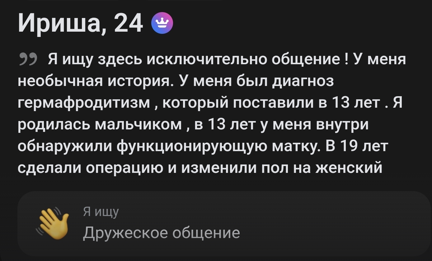 Q: А там все только секс ищут? A: Не все. Но всё равно больше, чем в других СЗ. Дохуя тех, кто ищут серьёзные отношения и вообще «Я не такая, я жду трамвая!» (что не мешает им в процессе прыгать на хуи чедов, впрочем, как и на других СЗ). Дохуя ебанашек перебежало с Тиндера после его закрытия.
