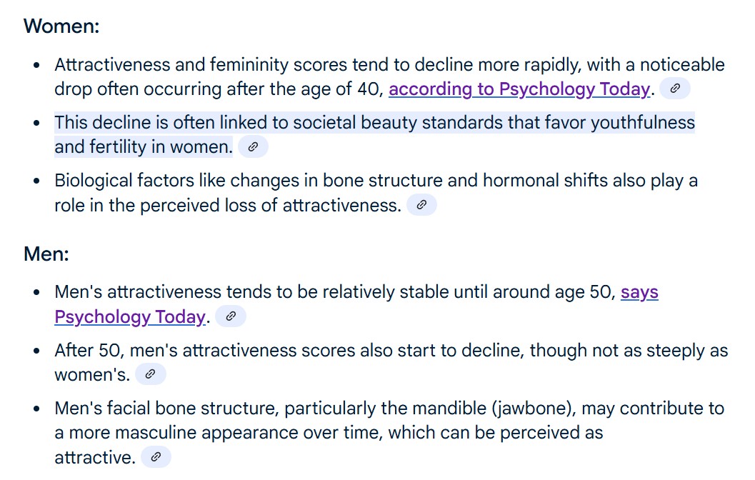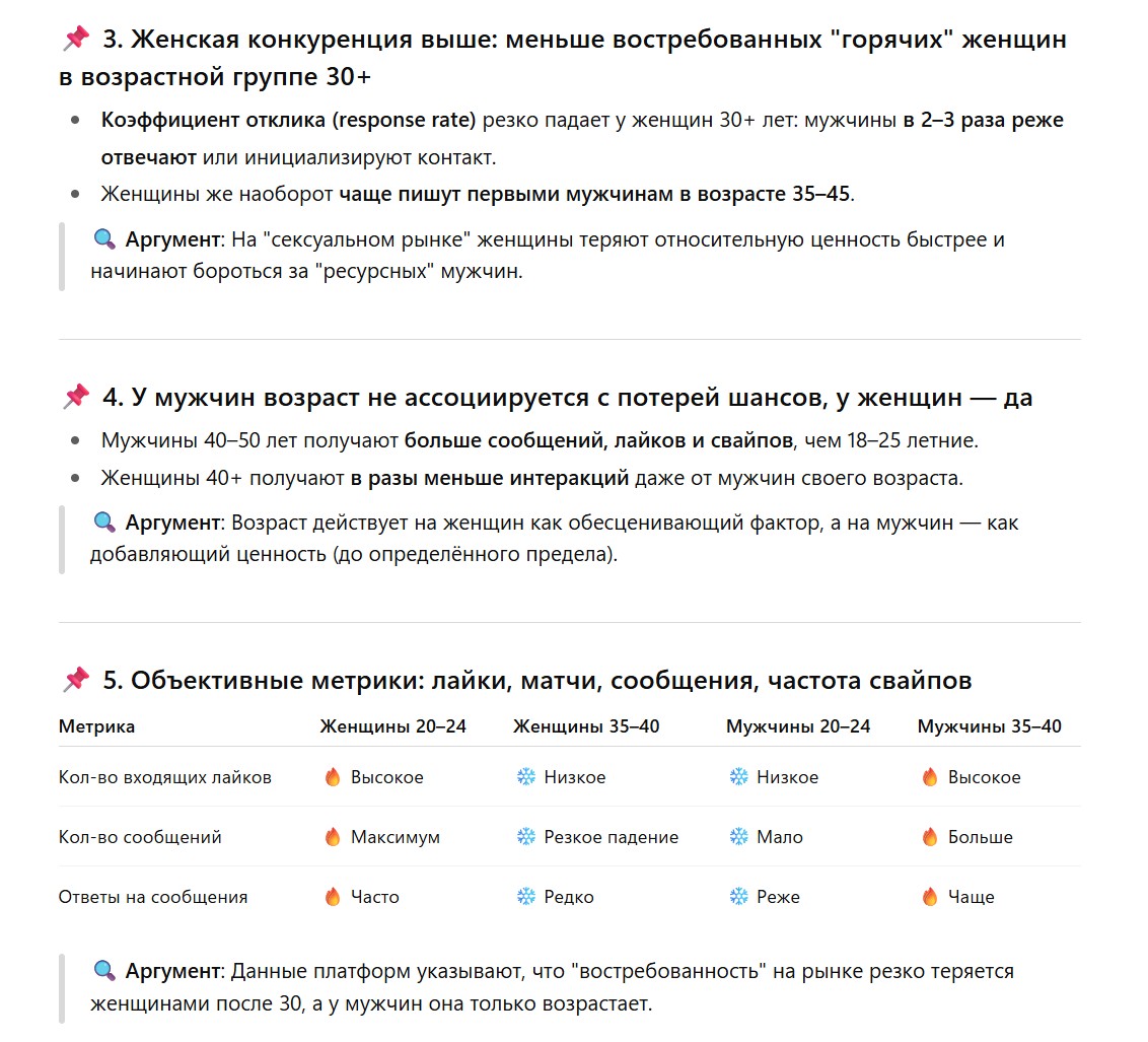 Но несправедливость-то главная ебаная в чём? В том что slavic женщины вообще-то С ВОЗРАСТОМ, дегродят по шкале физ.привлекательности / теряют ценность на половом рынке относительно молодух -- существенно быстрее мужиков. Любой более-менее понимающий как работает рынок отношений прекрасно знает, что падение привлекательности/желанности женщины, начинается лет с 23 и дальше неумолимо ебашит вниз по экспоненте. Да, у молодых ру женщин прекрасные внешние данные, объективно одни из лучших в мире, но параллельно -- с типом стрения / климатом / стрессогенной средой, точно так же, не очень повезло, а еще роды и чаще выраженное чем у м ожирение, так что уж по внешним данным дегродит средняя русская женщина, относительно молодух, стремительно.