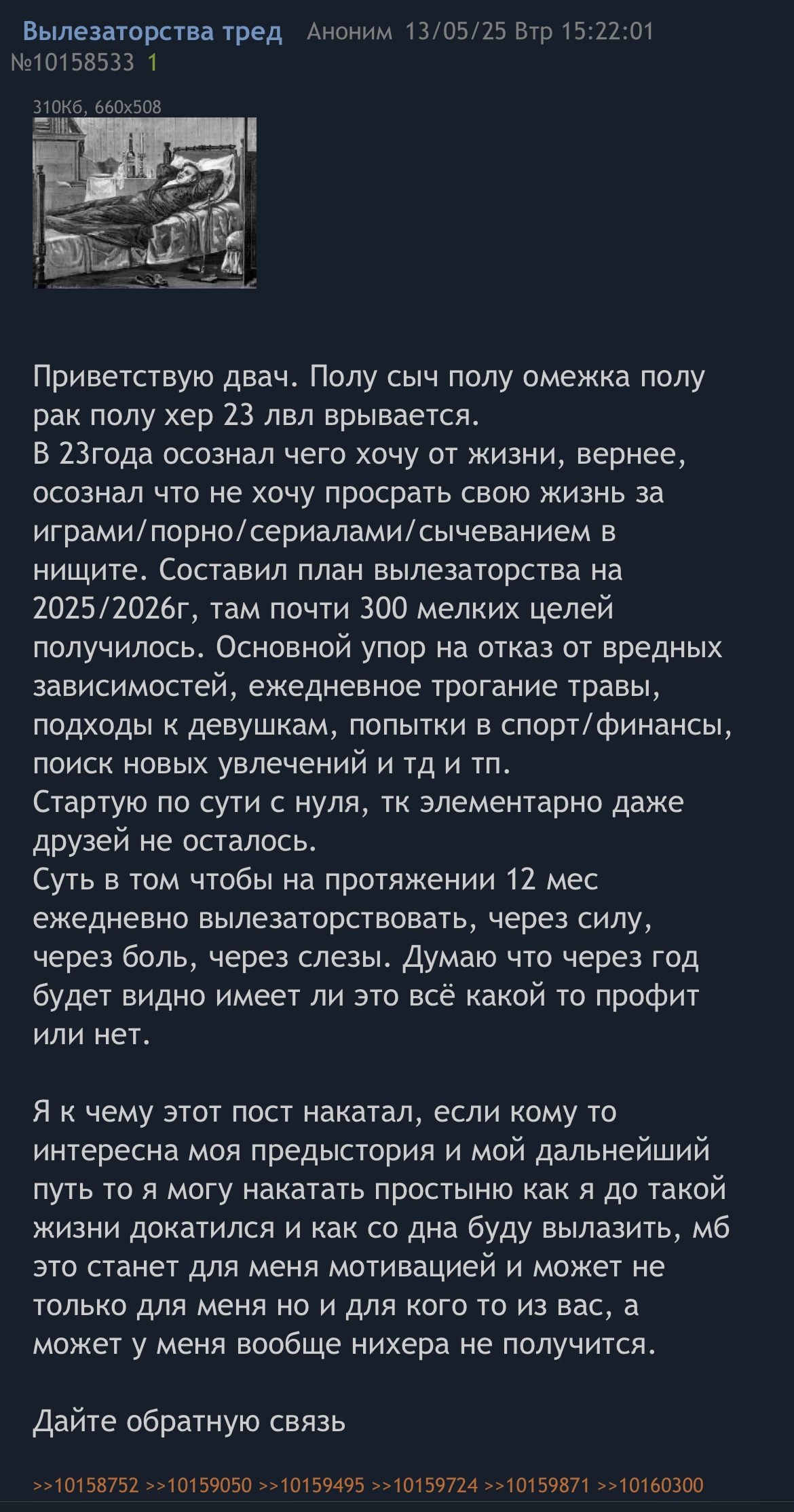 На связи автор треда с пика. Вообщем сегодня ровно пол года с начала моего вылезаторства и сделал я это наверное поздно, или приложил мало усилий. Сейчас будет урок для тех кто думает что найдет девушку и будет лампово сычевать, не будет. Закончились мои 5+ летние отношения, по причине уделял мало внимания (это правда) причем девушка ушла к скуфу который старше меня лет на 10. Эти отношения были токсичные и всегда их заканчивал я, это первый раз за почти 6 лет когда эти отношения закончил не я а она. Честно говоря я и так планировал их закончить, что было одной из причин начала вылезаторства, но планировал сделать это в следующем году, все произршло слишком быстро и неожиданно для меня, в первые дни эта ситуация выбила меня из колеи. На данный момент я понял что эта ситуация благо а не зло, я получил сильнейший буст, дороги назад нет, я снова без девушки, я снова живу у родителей, если я сдамся сейчас я умру. Я не стал срываться на алкоголь/сигареты и прочие свои зависимости, я решил уделить эту энергию на физ активность и работу. За эти пол года я что то понял, выстроил базу/фундамент которому нужно время чтобу настояться и можно будет строить дом. Это расставание оголило мои недостатки над которыми нужно работать. Вес кстати на данный момент 100кг (был 115) работаем дальше.