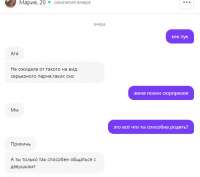 >>6801046 Тян считает что ты должен ее развлекать и вести весело диалог. Эти вопросы ей задают по 15-ть человек в день. Вот они ей надоели, поэтому она просто игнорит, если только ты не чед.