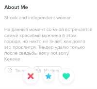 Вот только это всё равно не работает, и меня лайкают девушки, которые явно не способны обсуждать заданную тему. Очевидно большинство людей там и правда даже не читает био и интересы, а тупо смотрит на фотки.