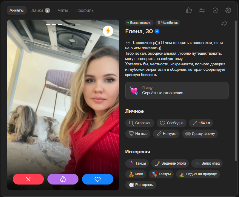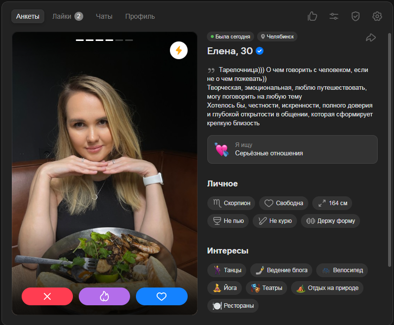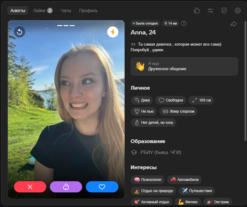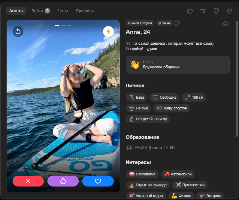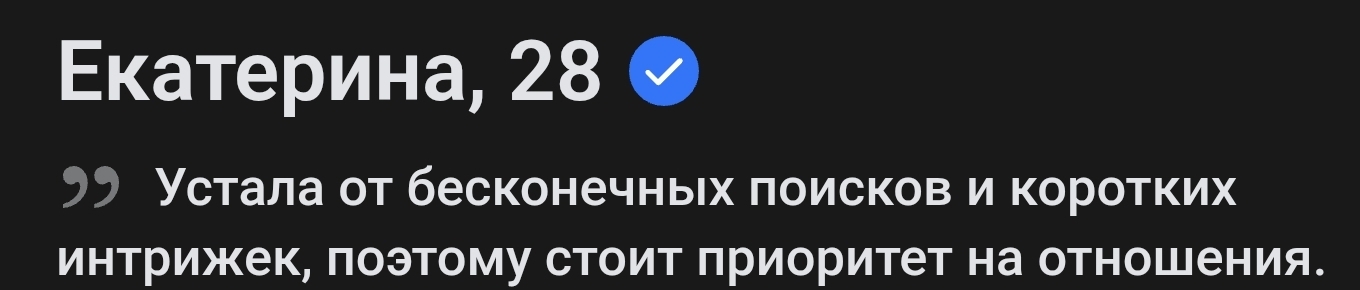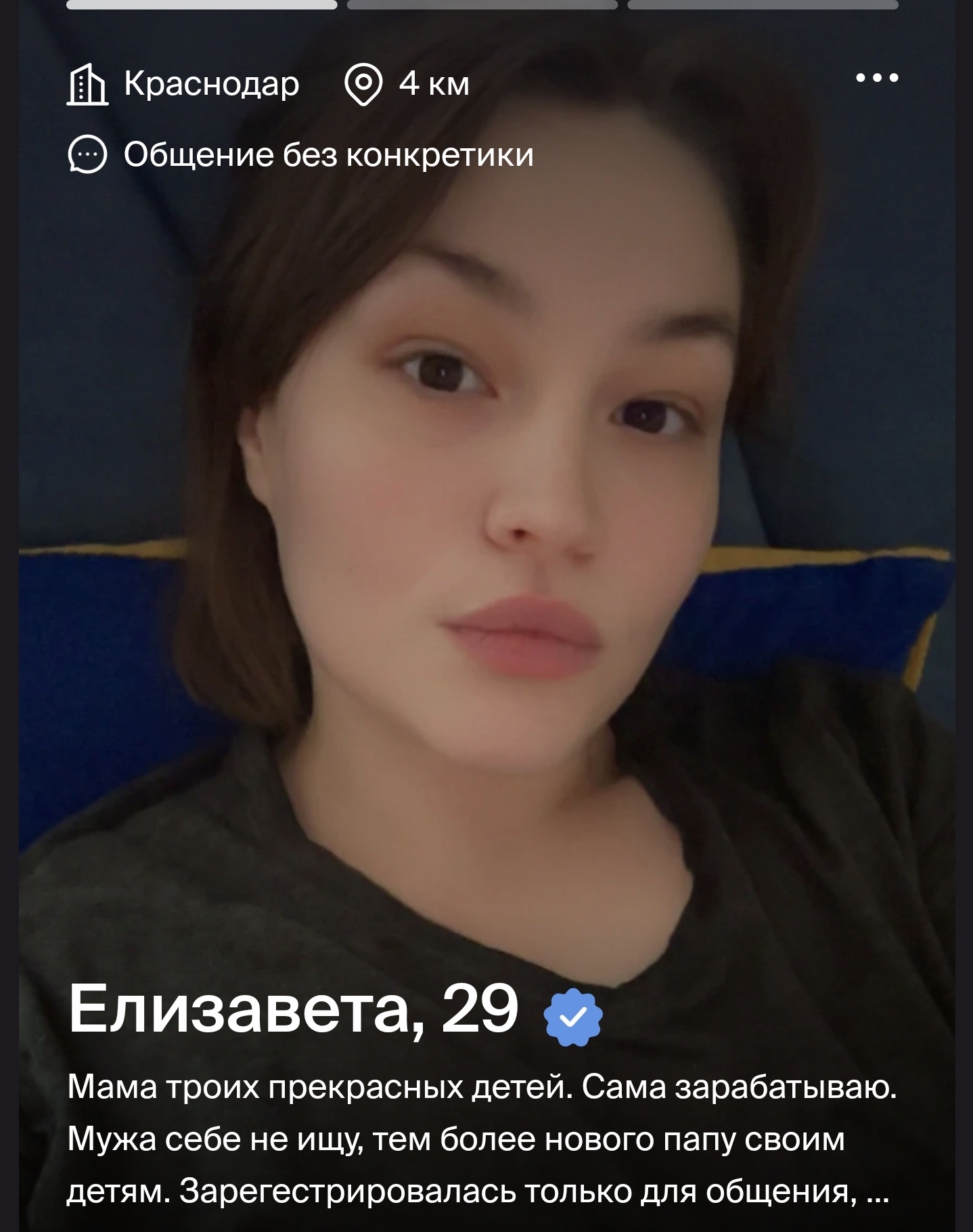 >>10258519 Бляяяяя, хуевый гайд, никогда бы не лайкнул анкету в которой есть что то про "щедрость". Это все равно что если я напишу - "мне только секс нужен", это конечно правда, но тяны такое лайкать точно не будут.