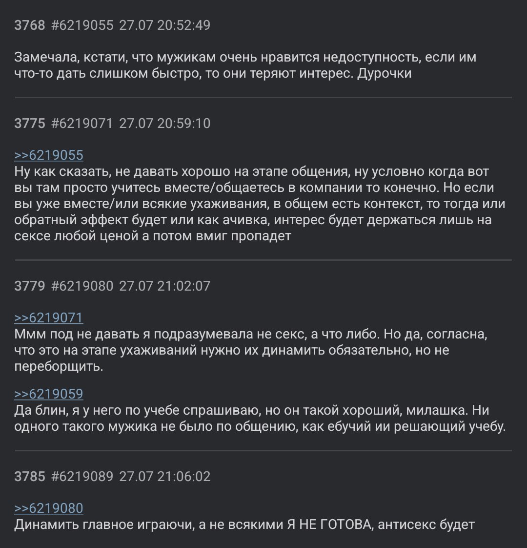 Я прочитал сейчас СЗ-тред в дев и сделал вывод, что анон, который тут про неважность количество лайков затирает - тян. Или он сейчас под видом тян постит в дев. Но, скорее всего, первое. Еще очередную тян лайкнул чэдикс, она намечтала до Владивостока, а чэдиксу, оказывается, только присунуть надо было.