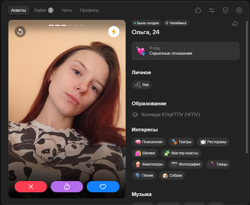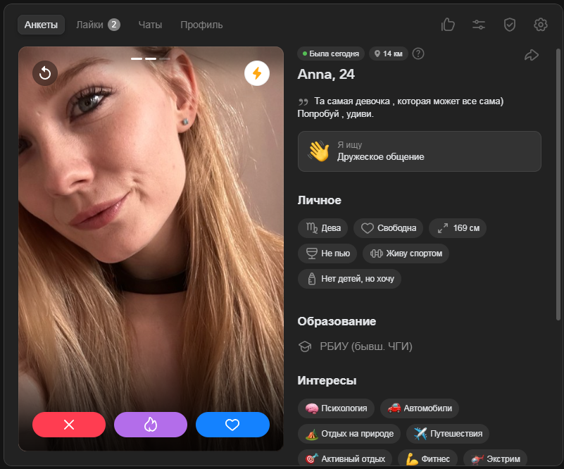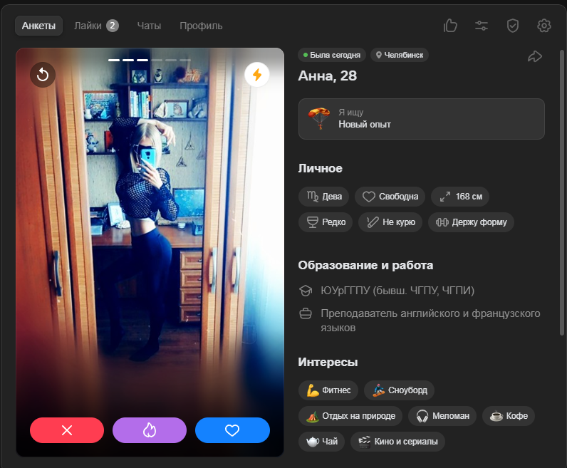 Зашле на ДВ. Пролайкал штук 20 анкет. Штук пять взаимок словил. 1. Одна пролайкала мои фотки и не отвечает на сообщения 2. Пообщались и перестала читать и отвечать. 3. Пообщались, договорились встретиться, а потом упс - я в блоке. Еще две не отвечают.