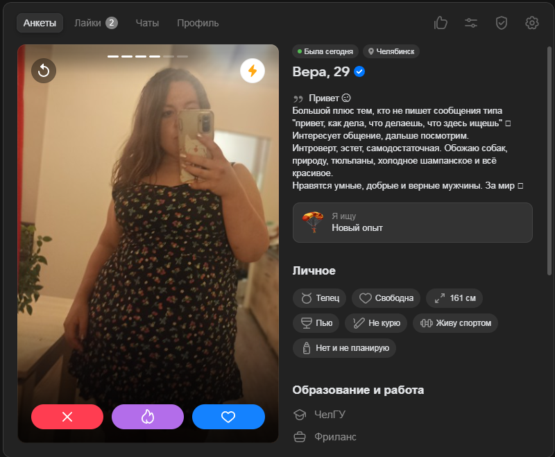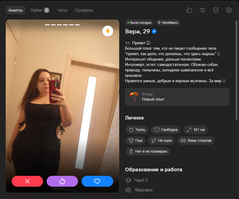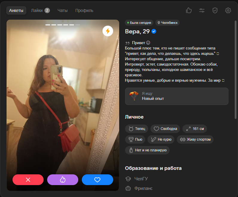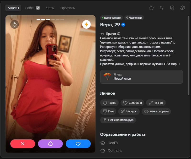 Добавляю к редфлагам хохлух. 2 подряд попались. Одна оказалась жирнее в 2 раза чем на фото, вот и со мной такое случилось. Душнила всякой задротской хуйней и ахуительными историями. Чувствуются деревенские корни. Из позитивного только сиськи, но этого мало.