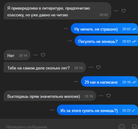 А не вот эти искуственные диалоги "Спать скоро буду укладываться)". Блять, скинь мем, расскажи сама что-нибудь, вброс сделай, задай встречный вопрос. Хоть что-нибудь, чтобы поймать общую волну
