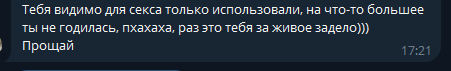 говорю, ТЫ ПОНИМАЕШЬ ЗАЧЕМ МЫ СЮДА ПРИШЛИ? говорит НЕТ, СТРАННОЕ МЕСТО говорю МЫ ПРИШЛИ СЮДА ЗАНЯТЬСЯ СЕКСОМ говорит Я ДУМАЛА ПРОСТО ОБЩЕНИЕ говорю ОК, РАЗЗУВАЙСЯ - ОБЩАЕМСЯ ИЛИ ПОКА тупит открываю замок, открываю входную дверь настежь, принимаю решение за нее уходит блокирует удаляет