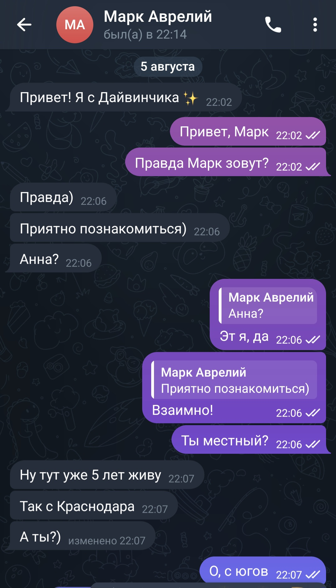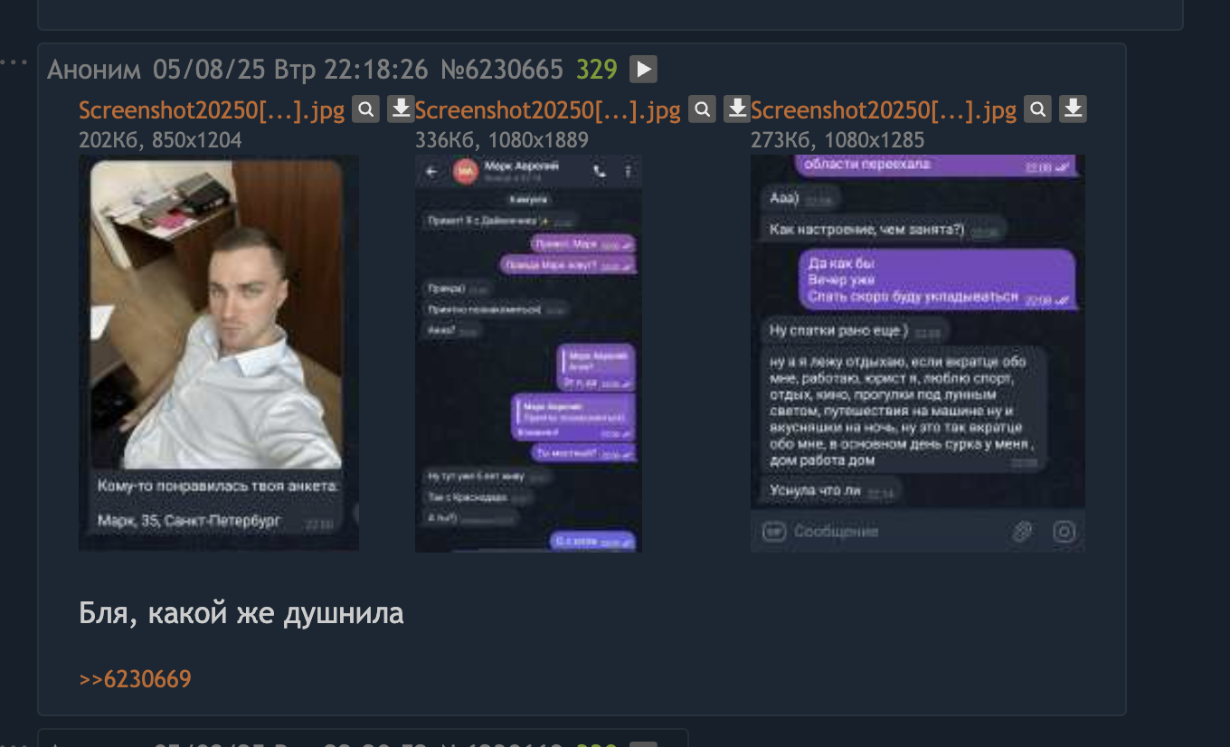 Тут двум собеседникам абсолютно похуй друг на друга. Но вообще он красавчик в том, что выдал сразу самый пиздецовый факт о себе, после которого любой нормальный человек независимо от пола прекратил бы с ним общение — он кубаноид