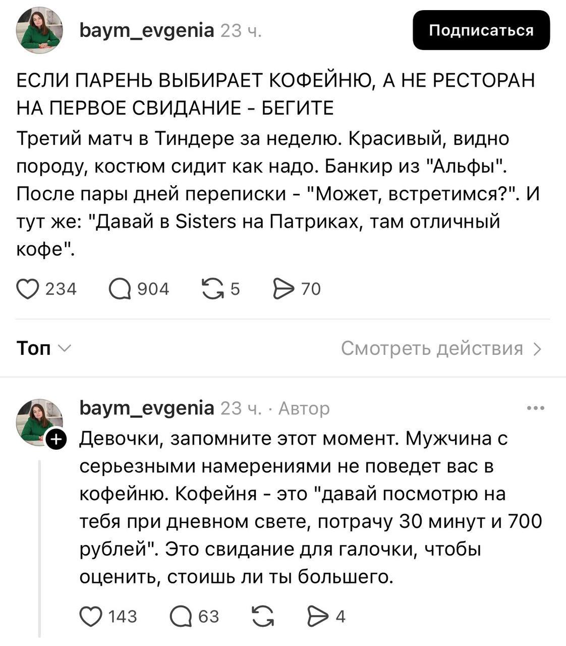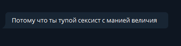 Вот на прошлой неделе буквально пришлось объяснять очередному мамкиному ПРЕДПРИНИМАТЕЛЮ, почему не буду давать ему секс. Буквально вот такой вот терминологией. Типа чел, я могу показать тебе инсту бывшего хотя бы, чтобы ты понимал, с каким уровнем парней я сплю. Но тебя же это размажет, кек. А так, ну выгулял, ну развлекайся, покормил в рестике, таксон вызвал, спасибо, молодец, поцелуй в щечку и пока. Ищи тянку по своему уровню.