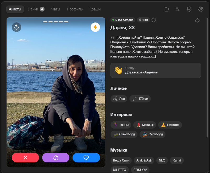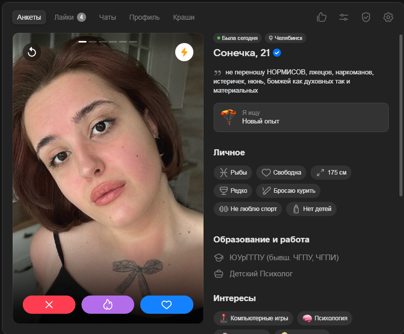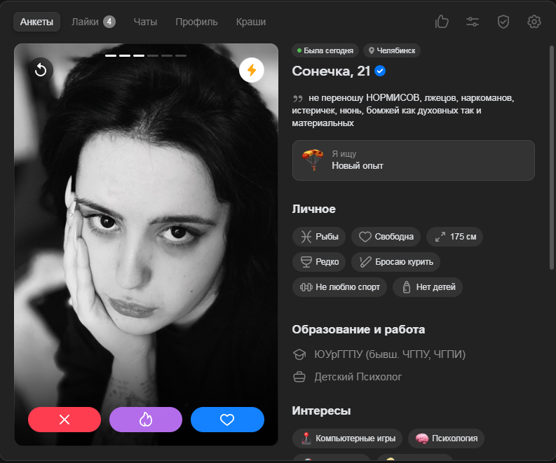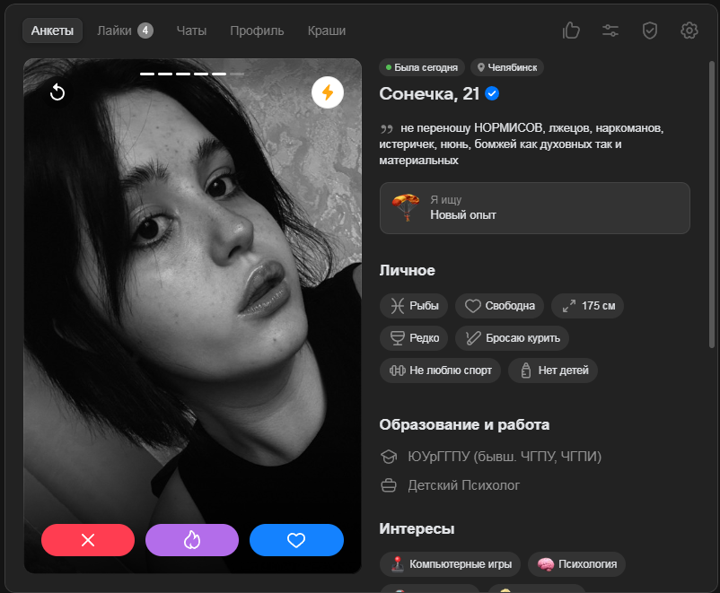 ДВ реально скурвился или я что-то не понимаю? Живу в мухосрани 150к, 27 лвл сейчас, лет 5 назад там активно сидел и получалось выцеплять зумерш на прогулки, каких-то просто на интересное общение. С одной таки даже удалось построить длительные отношения, которые кончились совсем недавно. От скуки чердак потек, решил снова пошерстить анкетки, и как же я охуел, когда понял, что выбирать-то не из чего стало. Для чистоты эксперимента анкету сделал вот прям как тогда - возраст, фото, текст. Количество тянов там будто сократилось, нахуй, в разы, а интересных анкет так вообще не дождешься - я про те, где хотя бы пара-тройка предложений есть, которые косвенно дают понять хоть что-то об организации внутреннего мира очередной персонаж_ки. Если раньше я лайкал ну условно каждую 10-ую и набраться их могло до конца пула штуки 3-4, то сейчас пул анкет из моего города кончается без единого лайка с моей стороны, после него уже начинаются другие соседние города в которых всё так же хуёво, между прочим . И сам лайки тоже раньше получал. Сейчас глушняк ебейший, прикола ради из других городов всё же полайкал - ноль взаимок, просто очко тотальное. Это точно не шедоубан, потому что пробовал ставить "похуй кого" - пару лайков от местных гомиков получал. В чём дело-то? Не 20 лет же прошло, ёпта.