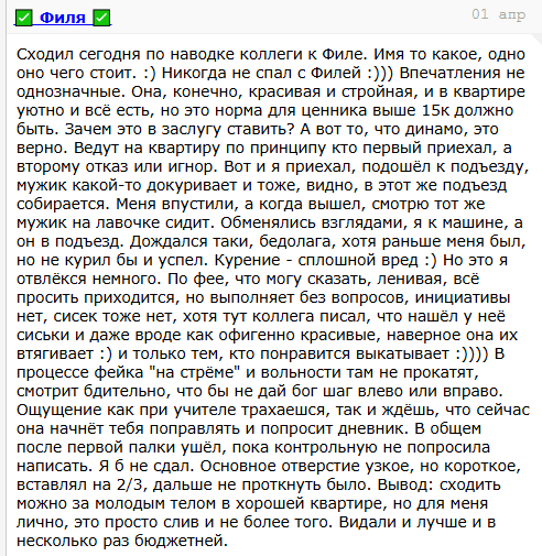 Индивидуалка, валькирия, очень няшкая, фигура топ, кроме сисек, тут к сожалению дряблые и немного висят, в остальном все классно. ГФЕ присутствует, сосется как в последний раз, не бревно. У нас с ней как то химия видимо сложилась и я получил мбр бесплатно, хотя может она просто забыла. Но поход оставил массу положительных впечатлений.