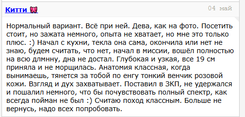 Сама тянка послушная, минет хороший, не бревно, сосется нормально, я бы даже сказал страстно. Узкая, долгую еблю переносит терпимо. После палки повалялись в обнимку.