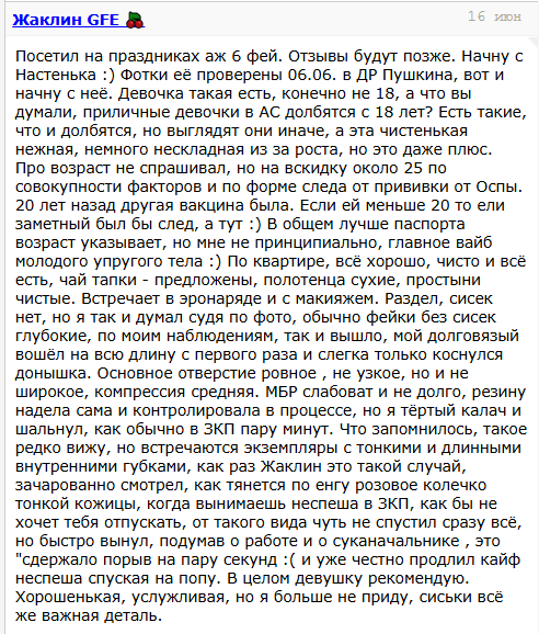 >>10286165 Да я теперь тоже так и делаю, а не жру говно. Но по началу, я прогревался на ура, ибо ходил в размытом возрастном диапазоне. Типа, пишет 24, а ей явно около 30, хоть и видно, что хорошо за собой следит. Вот от чего реально шишка рванула нахуй - когда ебал одну супер молодо выглядящую казашку/татарку. У неё реально внешка и пухловатое тело, как у 14 летней, но ей 23. Неидеальная фигура, лицо неоче, но чистенькая, нежная, ласковая, очень исполнительна, всё под тебя делает, и носочки, и чулочки. А голос звонкий, хрустальный, няшный, любителям маняме такая озвучка реально должна зайти, она именно похожа на хентайный голос, при этом не кринжовая. И стоимость колеблется от 7 до 10к.