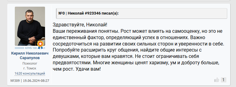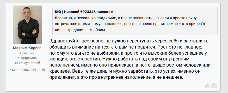 >>10285587 Он неосознанный. У любого процесса есть глубина: можно просто купить карандаши и неосознано рисовать лица людей - получится плоско, грубо и некачественно. А если осознано подходить к рисованию: понять что нет контуров - есть тени, а значит еще и свет. Художники еще более осознаны в своем деле. Так же и со свиданиями. Он пишет что просто пили чай, обнимались. Он что хотел от свидания? Какой был его мотив? Что он сделал для этого, а что нет? Как готовился к свиданию? У него нет такого уровня осознаности, как у нас инцелов, что внешность важна. Или как у пикаперов, что важна атмосфера, обстановка. Также у нас у всех есть психологические защиты, которые защищают нашу психику. У него явные отрицание и рационализация. Отрицание не дает ему осознать что он тупо ей не интересен больше - не зашел (внешне, финансово, поведением и тд). И то что он пытается понять что не так - рационализирует (ударяется в психологию, фокус смещает с себя на девушек, это как коуч джордж учит, мол у тебя не получилось? Да это она театральная просто - с такими не реально вообще, ищи пограничницу - у меня на бусти есть видео про них). Ему говорят - ты не зашел >вы ошибаетесь - опять отрицание. Он двигается по установкам "будешь ухаживать - тебя будут любить" - эта схема может у него и работала, но сейчас в силу скуфения перестала - хз, я его не знаю. По итогу: неосознанность, отрицание и рационализация психологией + некрасив и без денег (иначе бы получалось с девушками и установка "ухаживаешь - тебя любят" работала бы и он не сидел бы с психологами. 6'2 инцел на хардмаксе