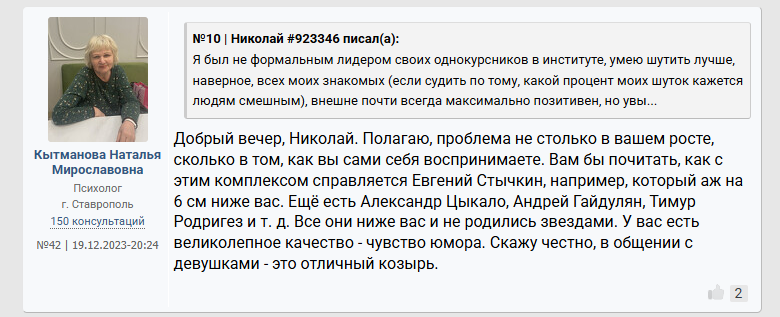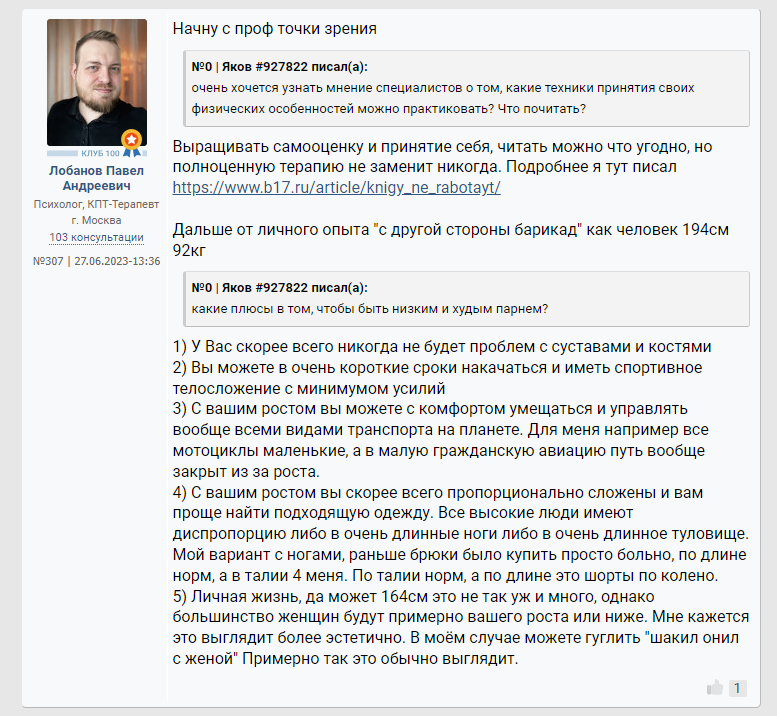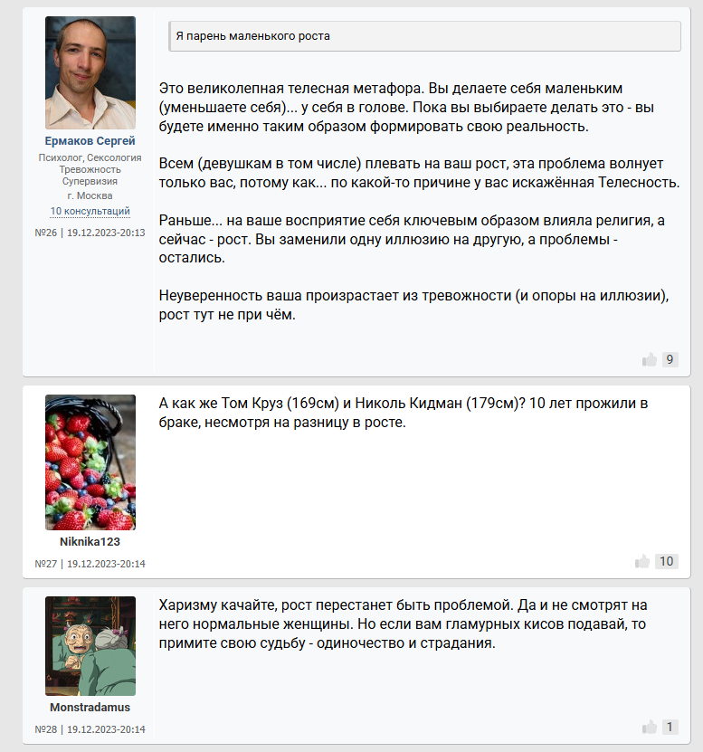 >>10284824 Помню какая то психологиня коммент оставила под опросом "что будет если вы проснётесь завтра 175 см обычным парнем" что то из разряда "Блииин уже проиграла ведь, с таким ростом только в петлю." Причём это не тролль аккаунт, а реально акк какой то пизды психологини из Мск.