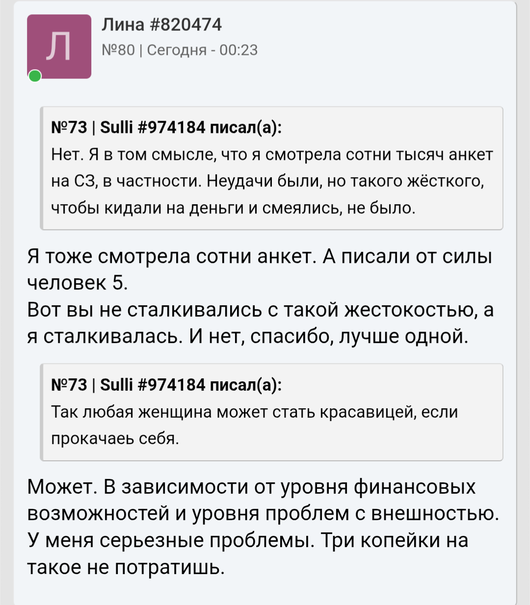 Запоминте карлики. Если для женщины не важна внешность и мужчина измеряеться по другому она либо пиздит либо ей за 30+ и есть наёбыши.