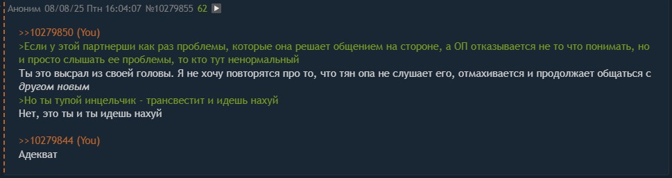 >>10279842 >Нормальный партнер прислушается к желаниям своего партнера Если у этой партнерши как раз проблемы, которые она решает общением на стороне, а ОП отказывается не то что понимать, но и просто слышать ее проблемы, то кто тут ненормальный?