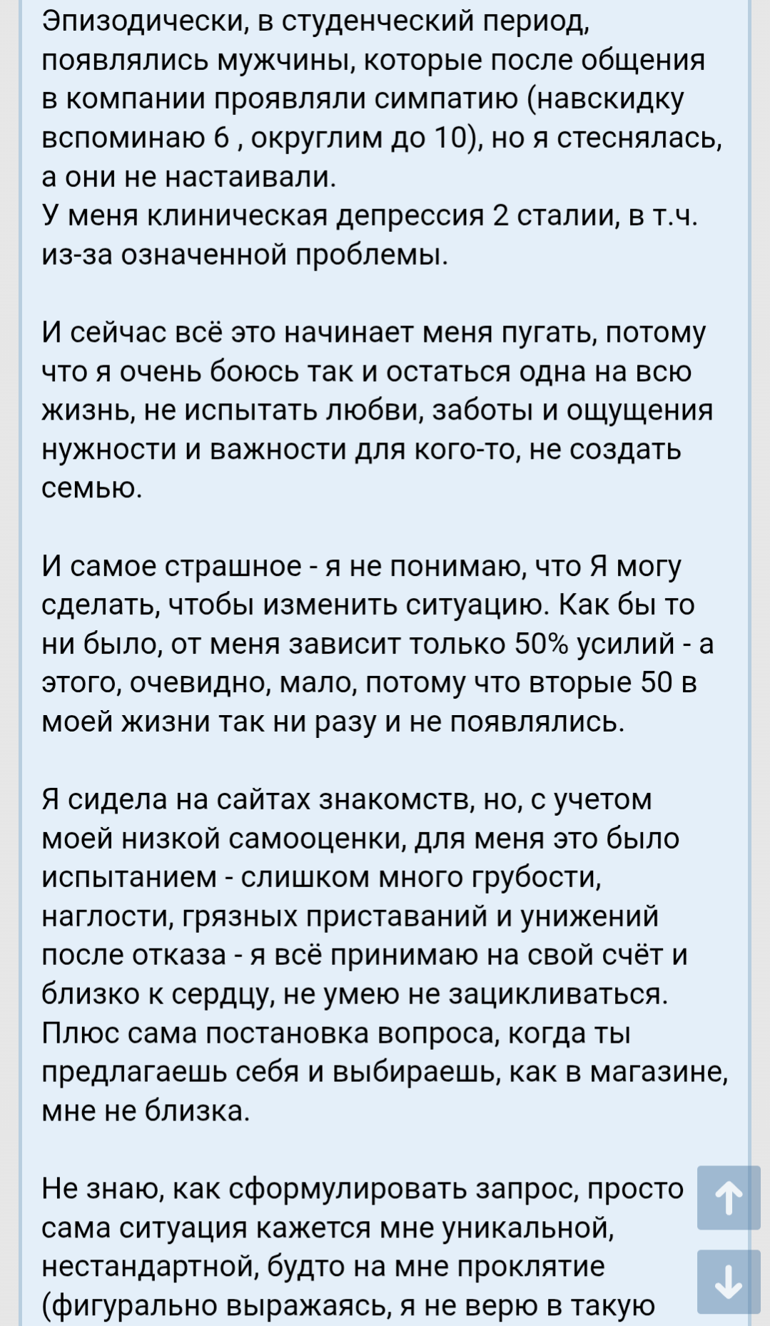 >>10288191 Вопрос как она найдет сыча такого? На СЗ? На дваче знакомствах? Мимо сыч подходящий под твое описание, но сам написывать тянкам на сз я не могу. Тип реалистично что если я запилю анкеты где только можно то мне может написать такая тяночка с оп поста? Или же это наивные мечты. У меня еще внешка на любителя, я далеко не мужественный, но и не женственный, андрогинное лицо, бледная кожа, 185,75кг, длинные волосы, 33 лет, не лысею (пока что лол). Кто-то давал мне 7, кто-то 1-2. В универе были тян которые сами лезли знакомится и хотели отношений, были комплименты от некоторых девушек, в целом когда иду по улице тянки от моего вида не морщатся, часто нейтральное выражение лица. От чего я могу сделать вывод что я не урод хотя бы.