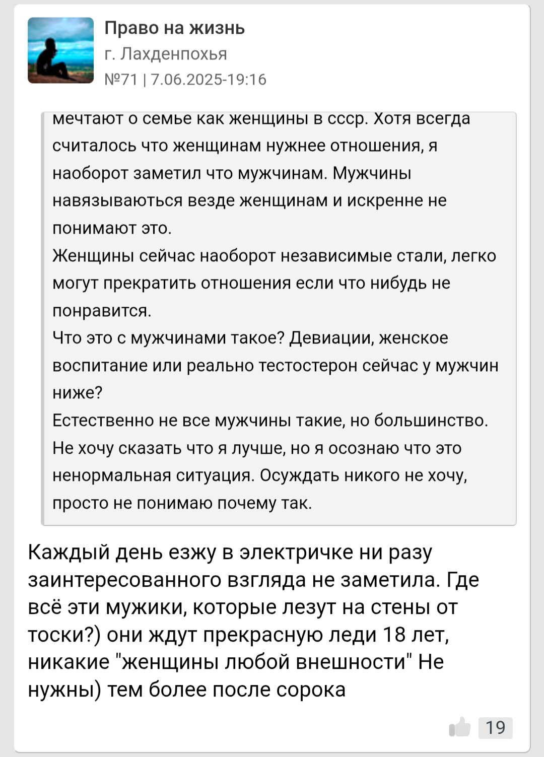 Суки проклятые, у нас демография в жопе, а они сидят обсуждают, как в 45 найти себе 20-летнего олигарха, и не слушать тех, кто говорит, что у тебя завышенная планка. ОПа вообще за пропаганду нетрадиционных ценностей набутылить надо.