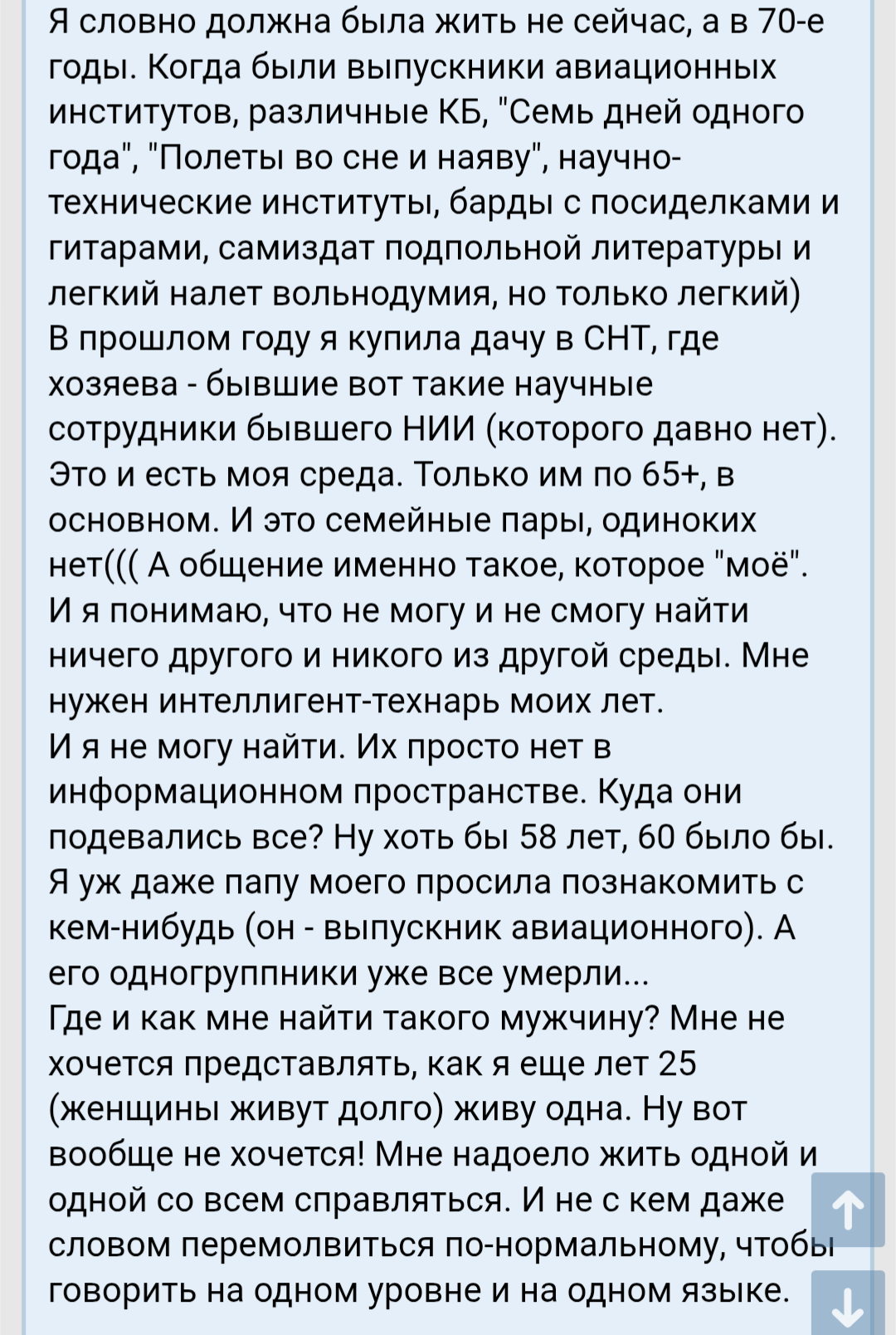 Так что условно вечный поиск "годно-куна" в итоге заканчивается либо одиночеством в 45+ со случайными связями на стороне либо браком с рандомчелом в 35+ по принципу "лишь бы штаны в доме были". И то по-факту проеб и грустная жизнь. Либо в одиночестве с осознанием того, что время летит, морщины углубляются и впереди только грустная и одинокая старость, либо с непонятным мужиком, к которому ничего не испытываешь от слова "совсем" и с которым придется жить целую долгую жизнь.
