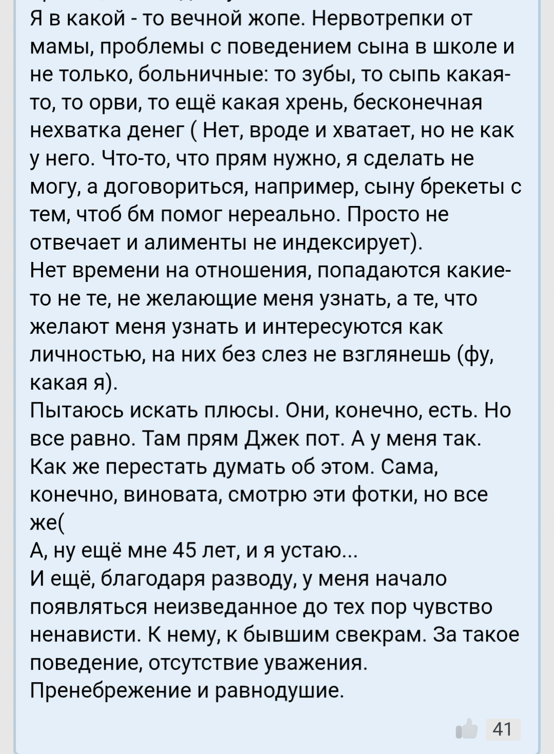 Так вот поняла что смогу прожить без мужика. Раньше казалось, что депрессия и гроб-гроб-кладбище, а щас понимаю, что норм жить и так. Тем более, когда мне периодически родственница оставляет своего песиля. Закрывается отчасти материнский инстинкт и ласку есть кому отдавать. Может быть в будущем заведу себе своего песика.