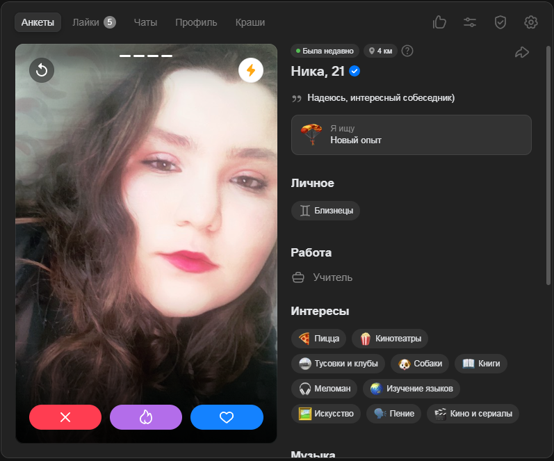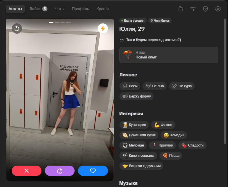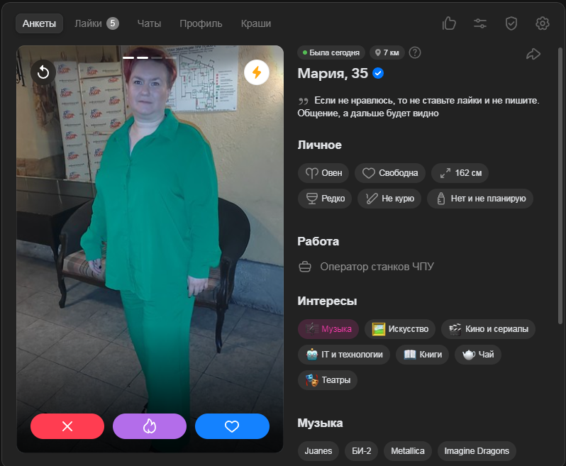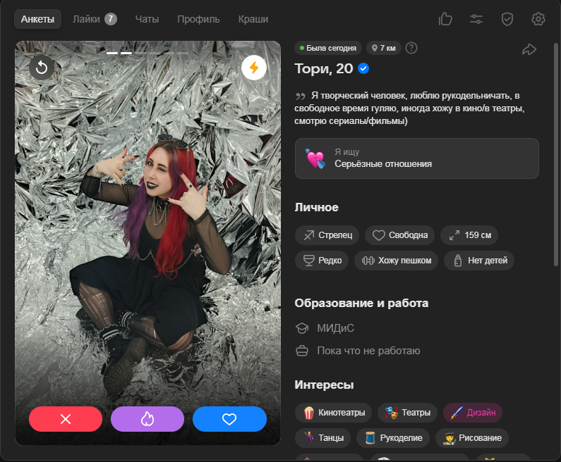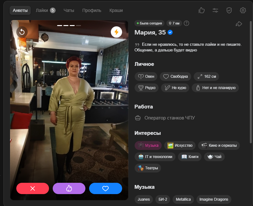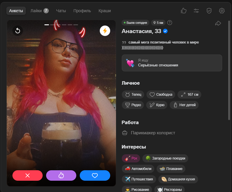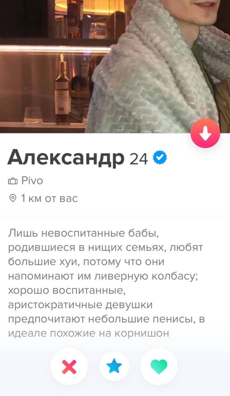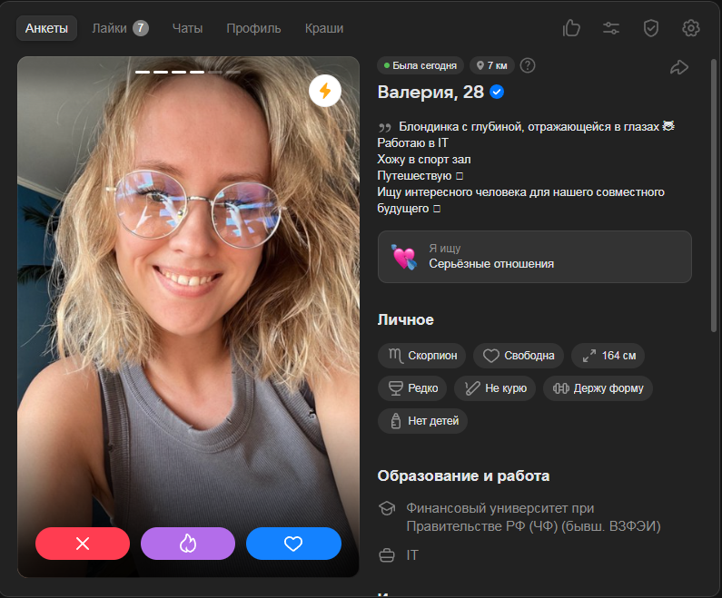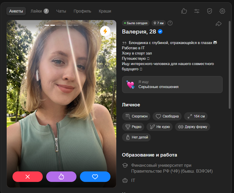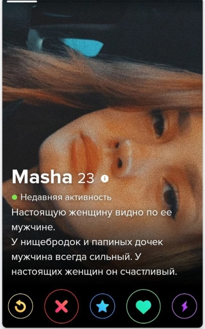 Это я вам говорю как чел который когда 7 лет назад в тиндере регался, сходу получал 10-20 матчей и затем стабильно по 2 в день лайка, сука по 4 свидания в неделю было.