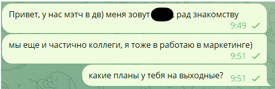 >>10299023 Первое сообщение слишком длинное - просто "Привет". "У нас мэтч в дв)" - А ЭТО ВООБЩЕ НАХУЯ? Почему пишешь имя? У тебя пустой тг без фоток без всего? Удачи с дв, лолблять. Понижаешь конверсию в 2-3-4-20 раз. "Рад знакомству" - это что такое? Фу.