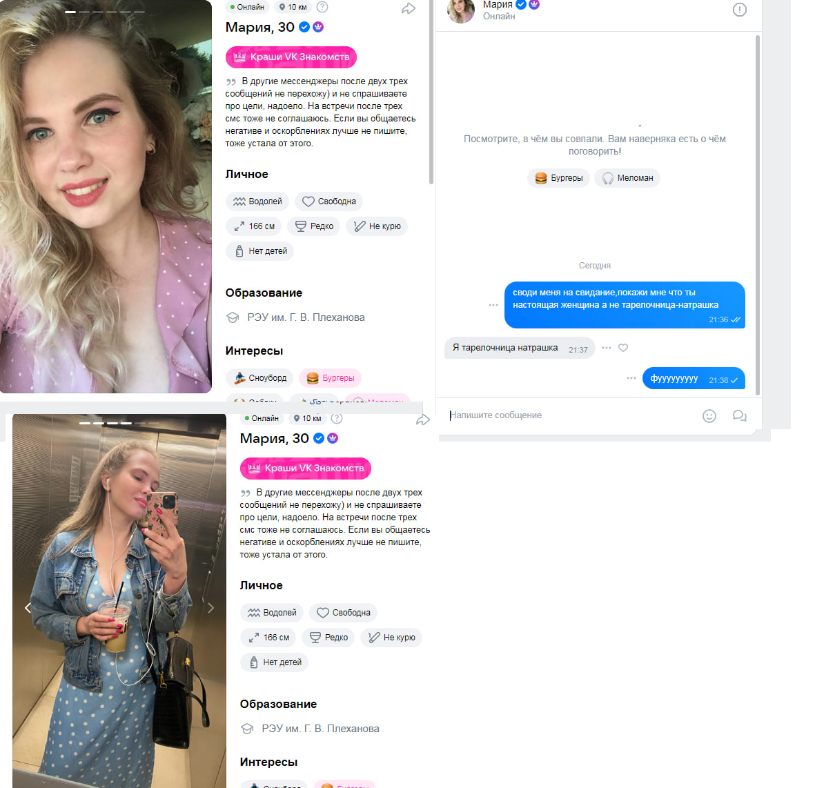 Ну вот я 7/10.Фигли со мной ведут секс переписки и идут на свиданку "фасовщицы" 5/10,которым я заказываю кальян,катаю на машине,а у них искры блять не возникает после встречи,даже когда были засосы?Неужели просто поебаться не хочется?