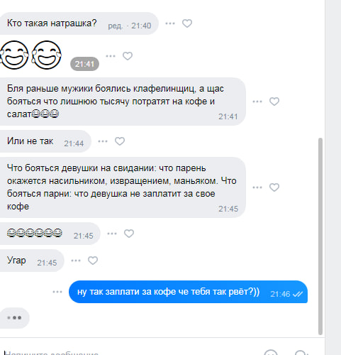 не хочешь общаться по телефону , максу или что там в моде у вас - тогда бегай по кафе ходи в кино и окажется что 19 из 20 , "не готовы к чему то большему чем прогулка" "не отошли от предыдцщих отношений" " извини там ц меня другой типаж " и прочее . и ты будешь как большинство здесь коупяшиз с разорванным очком арря созвониксы фантазеры я сходил на 10 свиданок мне писик не дали. Нюанс в том, что созвониксам эти 10 баб , которых выгуливали тоже скорее всего не дали бы, они их просто скипнули, не теряя времени.