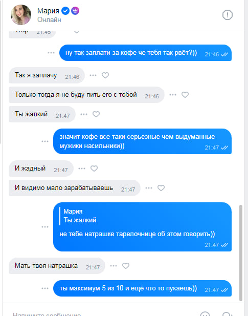 Я просто вспоминаю, как общался в школе с друзьями и о чем. Кратко — спори любую хуйню и на нее ответят хотя бы вопросом. То, что на скрине это не общение с человеком. Это общение с NPC. Я не знаю, зачем вы продолжаете потакать этим блядищам, которые сохнут по 5% мужчин. Пора послать нахуй шкур, они испортились уже давно и едут их натуральное умственно отсталое быдло с претит фейсом, или хотя бы ростом.