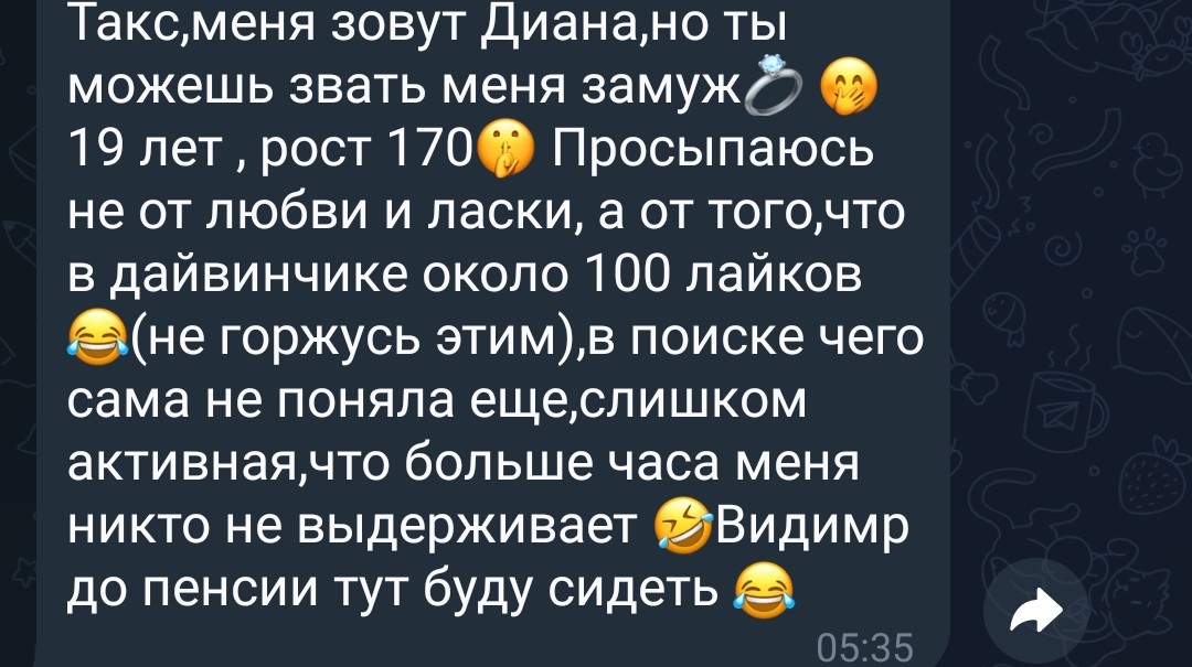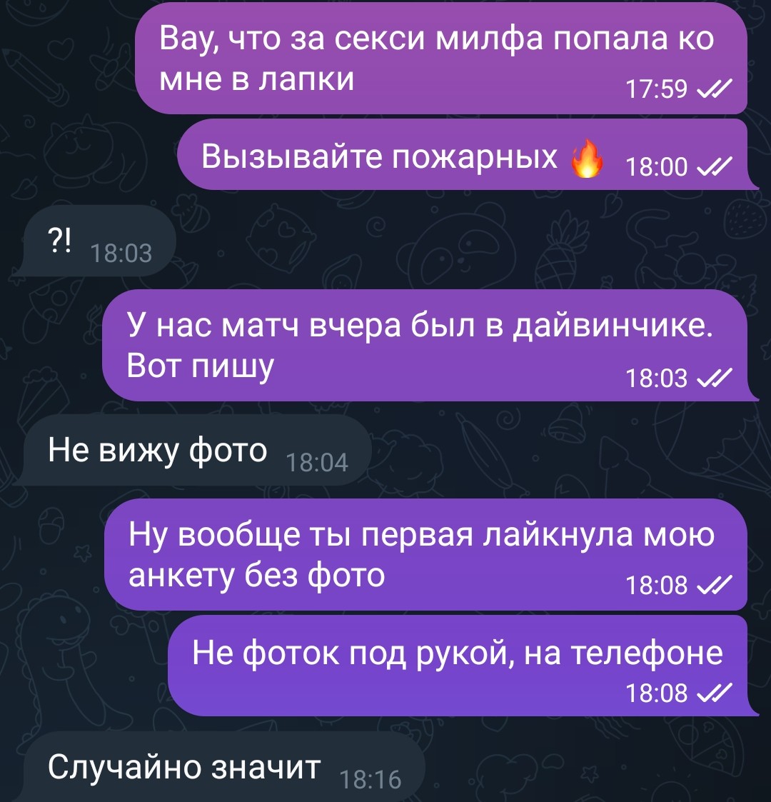 >>10299109 >"У нас мэтч в дв)" - А ЭТО ВООБЩЕ НАХУЯ? А что в этом тебе кажется странным? Я пишу ей не в приложении же, а в Телеграме, почему бы не уточнить откуда я взялся? Мне, например, дохуя по работе пишут люди в ТГ и на мой взгляд представиться и объяснить откуда я нарисовался - это адекватно. ТГ не пустой, фотки из поездок, Япония, Европа, корочеотносительно успешный успех
