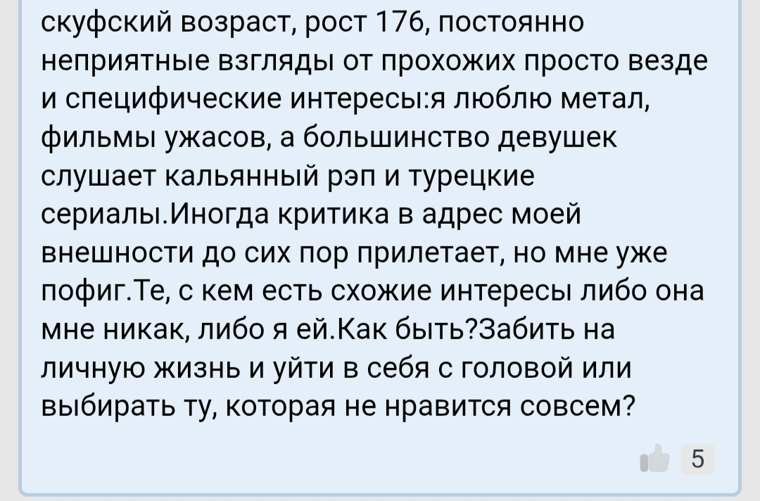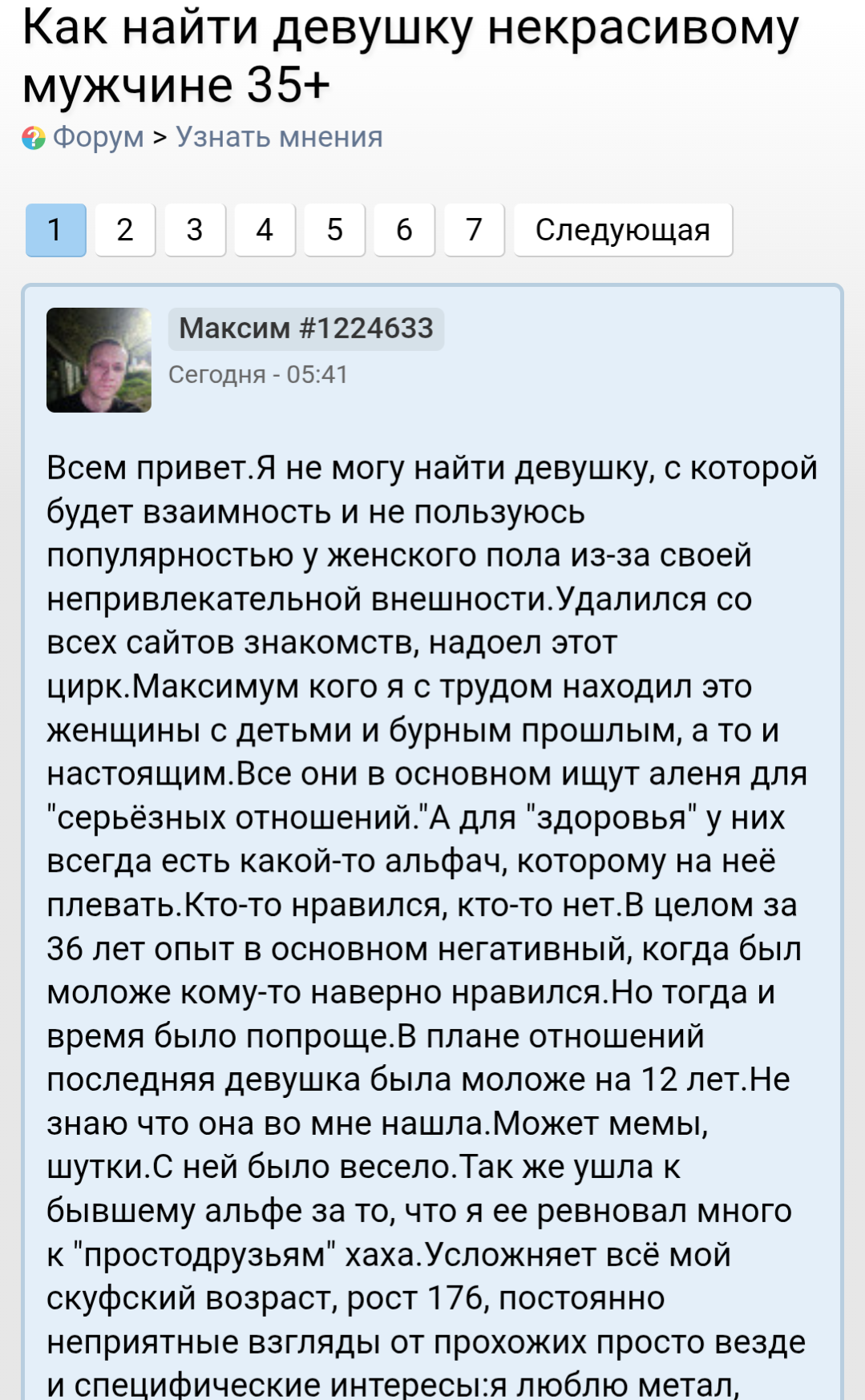 Есть ли тут такие как я, у кого экзестенциальный страх даже анкету завести в дайвинчике? Есть только 1 норм фотка, в анкете даже не знаю чё написать. Единственный мой плюс это Ростик 1,89 да треха в центре мухосранска. Сам нищеброд в 50к, 29 лет да и хиканю часто за просмотром сериалов и аниме. Хз найдется в мухосрани 500k хотяб 5 из 10 на меня(Господи только не жирная, это единственный редфлаг который я не могу отпустить) или можно дальше от одиночества крышей ехать?