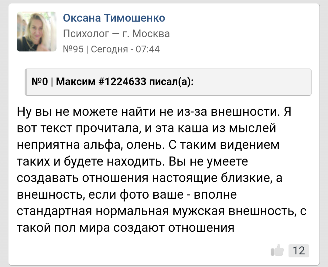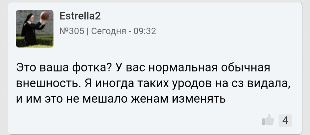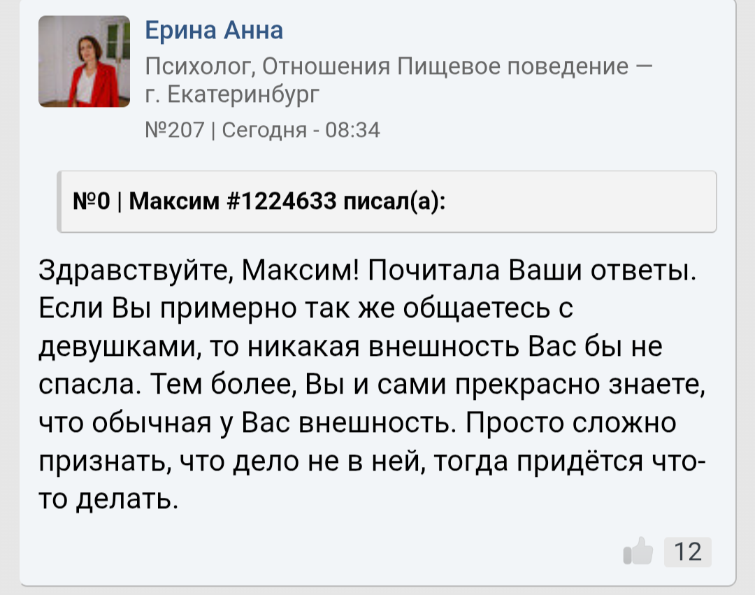 >>10303572 >Там регулярно лайки прилетают, надо только ждать пока первая напишет, тогда считай вин. Не смешно. Лайки там прилетают от жирух в основном и некрасивых тян, очень редко от красивых и их практически нереально выцепить ирл, у меня за все время сидения на сз один раз лишь получилось перекатить фитоняшку ирл и она меня слила все равно после 2 свиданий.