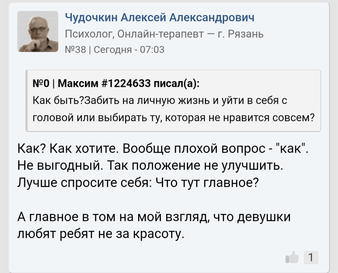++++ Когда со мной на регулярной основе начала общаться тянка, я в течении двух дней вылечился от этой вашей депрессии , появилась тяга к жизни, снова все стало каким-то ярким как в пиздючестве было, перестала ебать инцелошиза и возрастошиза вообще, начал заниматься какими то вещами, ждал общения с ней как прихода бога