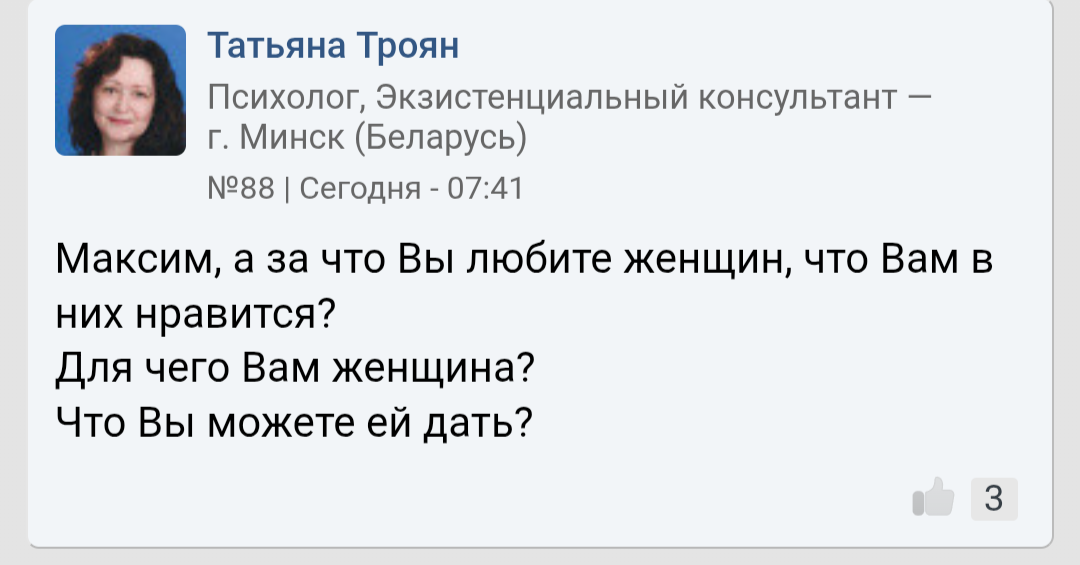 Ну и будь все так устроено, как по инцелошизе писано, она бы мгновенно ушла от него ко мне. Но она не ушла. Сказала, что любит.