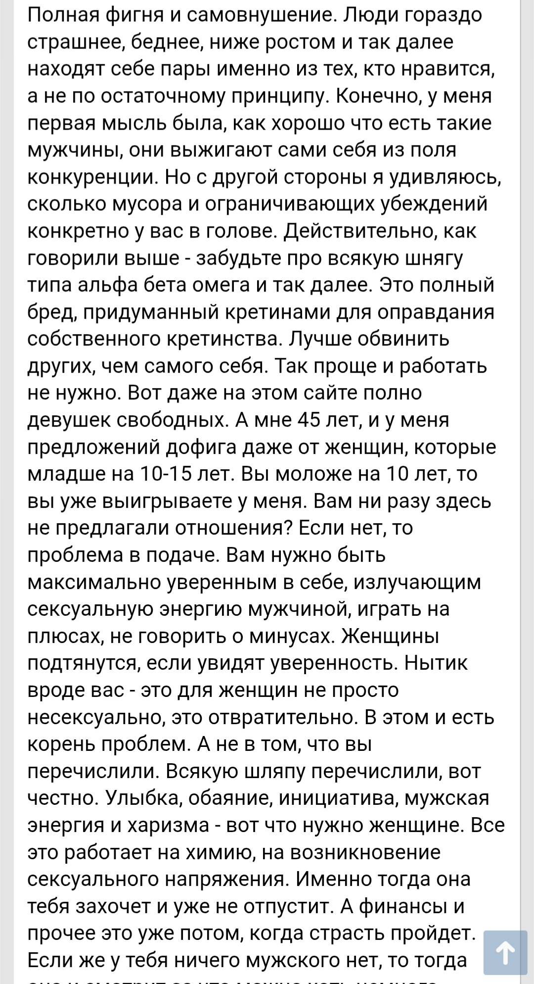 >и бери все до чего сможешь дотянуться что я должен брать? мне 30 в этом году, девственник без друзей и общения. у нормисных тян к этому времени уже дети и бывшие за плечами, а я чистый лист, я для них презираем, отброс и биомусор