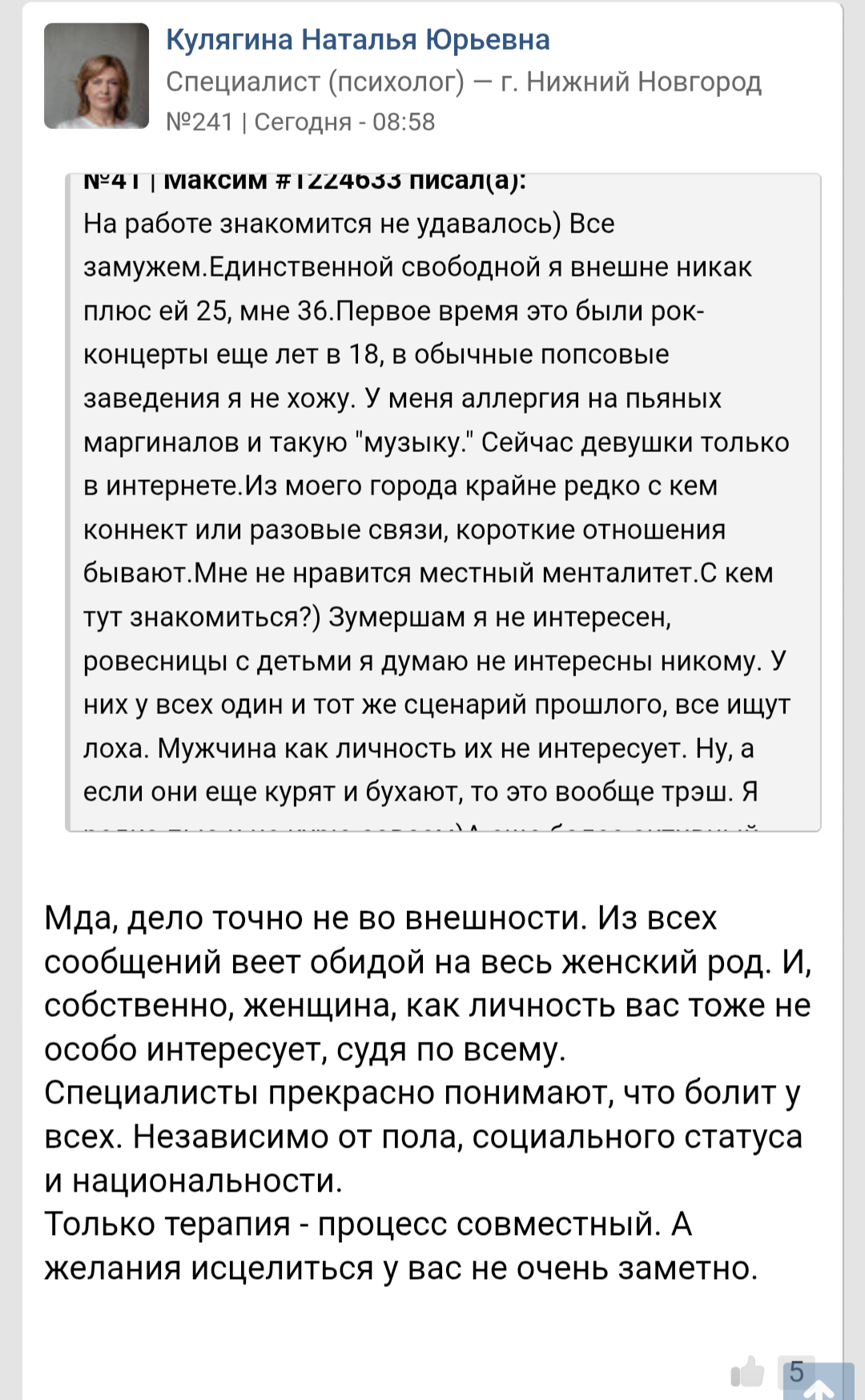 Привет. Давно к вам не заглядывал. Хочу дать совет менталуелам еще разок. Пожалуйста сходите к психиатру за рецептом для АДов. Я после них начал меньше ныть, появились силы и фемцелочку нашел в итоге.