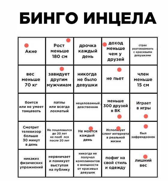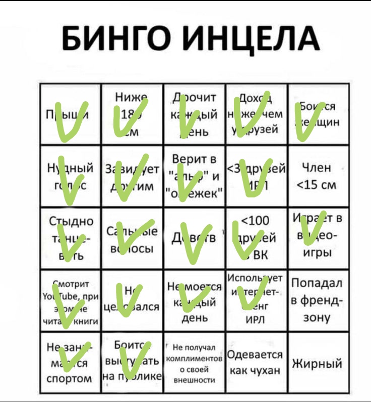 В тред приглашаются инцелы. Если ты выбил комбо по этим пунктам: 1. Рост ниже 175 см; 2.1 Член менее 13 см. по длине; 2.2 Член менее 11 см. по обхвату; 3. Внешность хуже, чем 5/10; 4. Физические и/или психические болезни; 5. Норвуд; (лысеющие) 6. Короткие руки; 7. Дистрофия или ожирение; 8. Грушевидная фигура; 9. Проблемная кожа; 10. Опухшесть лица; 11. Глаза жертвы, косоглазие; 12. Дефекты речи, То добро пожаловать на наш раут! Тут мы обсуждаем бытие некрасивых кунов, поддерживаем друг друга, желаем рака мозга симпам. Аминь.