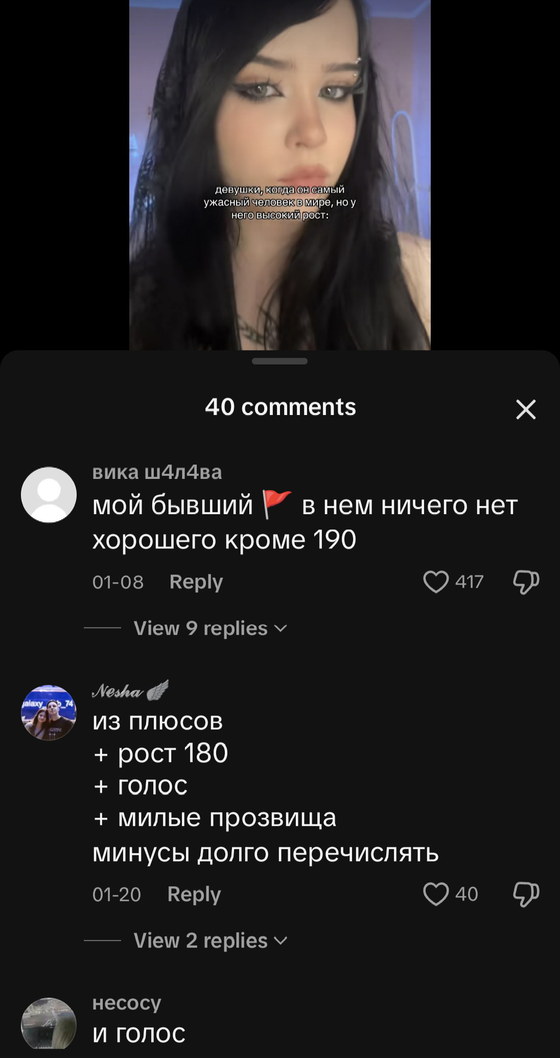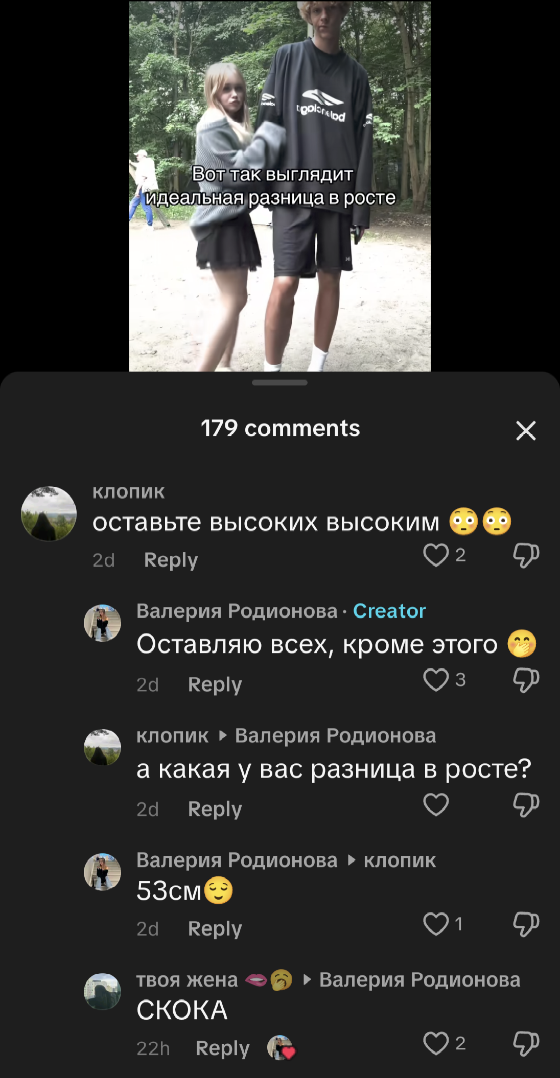 Комменты просто атомный блэкпил тут. Нашел только что. - А высоким девочкам ходить с мальчиками 170? Ну просто все миниатюрные разбирают высоких,а высоким потом грустить😢 - Солнце, я уверена, что все будет!! 🥺 - Ну блин,разве это хорошо,когда партнер ниже тебя?