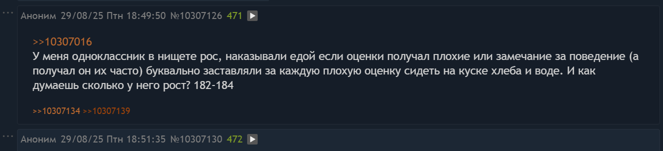 >>10307016 У меня одноклассник в нищете рос, наказывали едой если оценки получал плохие или замечание за поведение (а получал он их часто) буквально заставляли за каждую плохую оценку сидеть на куске хлеба и воде. И как думаешь сколько у него рост? 182-184