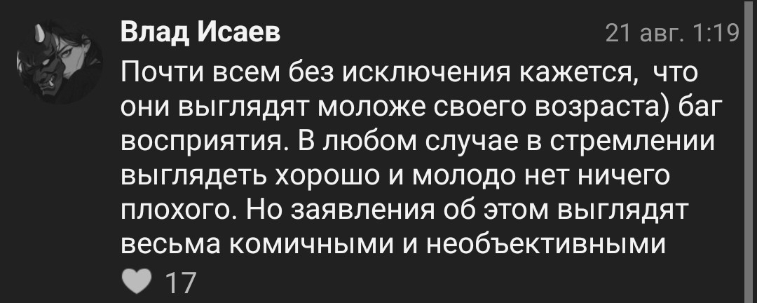 >>10302498 >>10302499 Ну, справедливости ради, я в 32 выглядел так, что 22-летние меня с ровестником считали. Но это тогда, а в 35+ выглядеть молодо - извините, как говаривал Станиславский: "Не верю!".