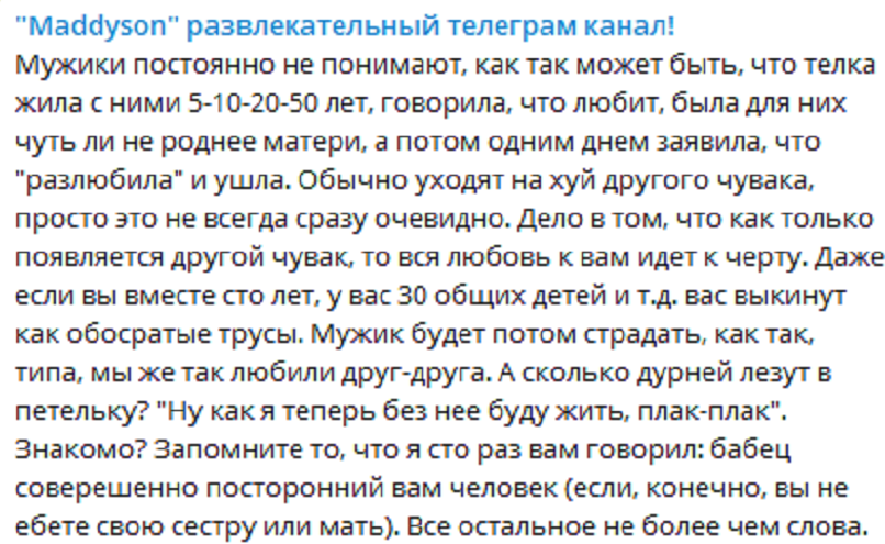 >Мужчины в среднем, даже если женщина им изначально не очень нужна была, думают "а как она отреагирует", "а как она себя будет чувстовать на следующий день, вдруг что-то сделает с собой", испытывая желание писать и писать, у женщин всего это просто нет. Просто ненавижу таких мразей, которые сами дропнут и при этом годами после этого ебут мозг. Я бывшего блокировала везде и этот урод звонил с чужих телефонов. Чтобы что? Рассказать как охуенно ебется с телкой к которой ушел? Просто ебанутые садистские мрази все кто так делает. Уходя уходи.