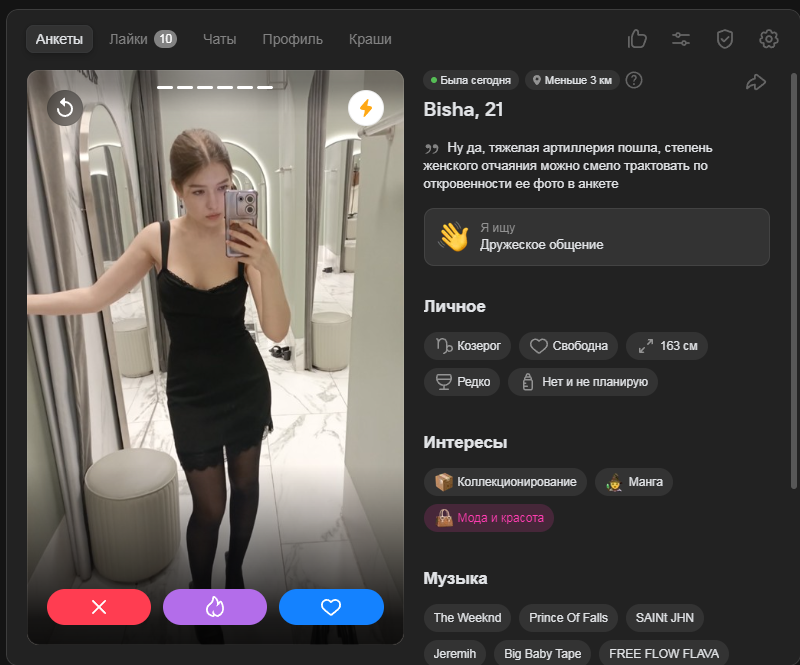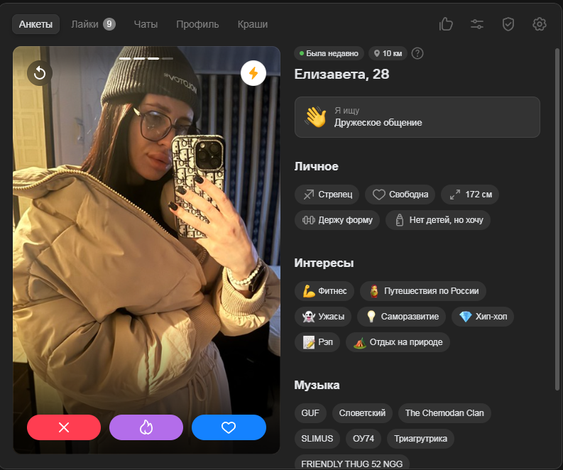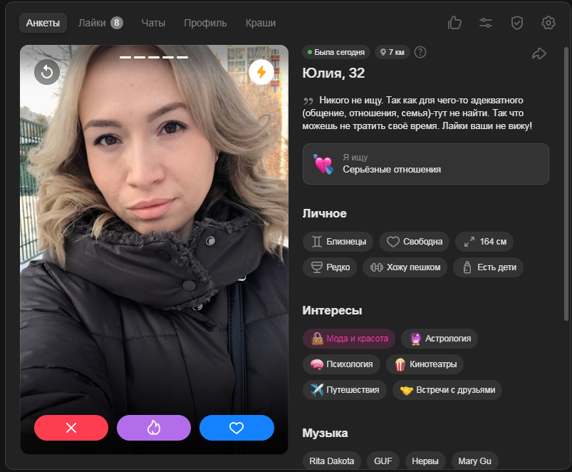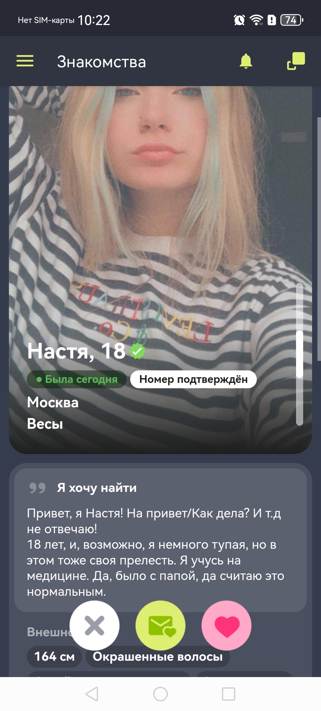 Касательно моей ситуации, все иначе. Выгляжу я не как скуф в 25 лет фф 8-9, но и до патлатых нефоров, кумиров малолетних зумерш из тиктока не дотягиваю. Но у этой среднетян такого и не будет никогда, максимум в роли фвб, хули она настолько тупая, чтобы это понять? Это все равно, если бы я намеренно искал только солевых альтух с разноцветными волосами и тонной макияжа.
