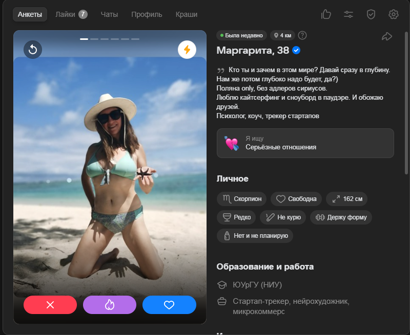 >>10306638 Давайте объективно оценим катю. Сколько она по десятибалке? Легко ли было бы развести на секс среднекуну с сз? Что-то мне подсказывает, она оценивает себя минимум на 8. Хотя лично я бы очень задумался прежде чем ее куда-то свайпнуть, для меня она прям базовая среднетян. Скорее всего ключевую роль играло бы описание, а учитывая что там было бы что-то про джусболы и сбер, то это инста свайп влево без сожалений.