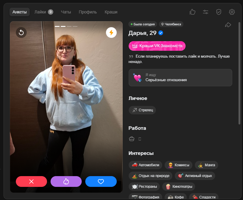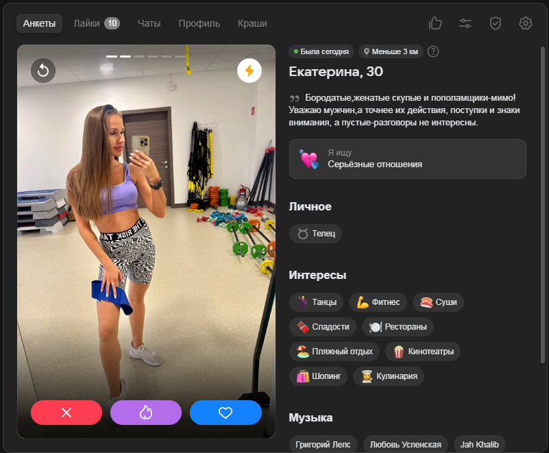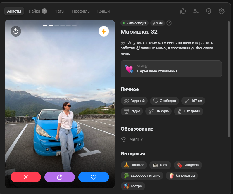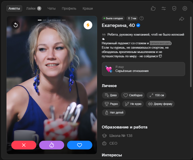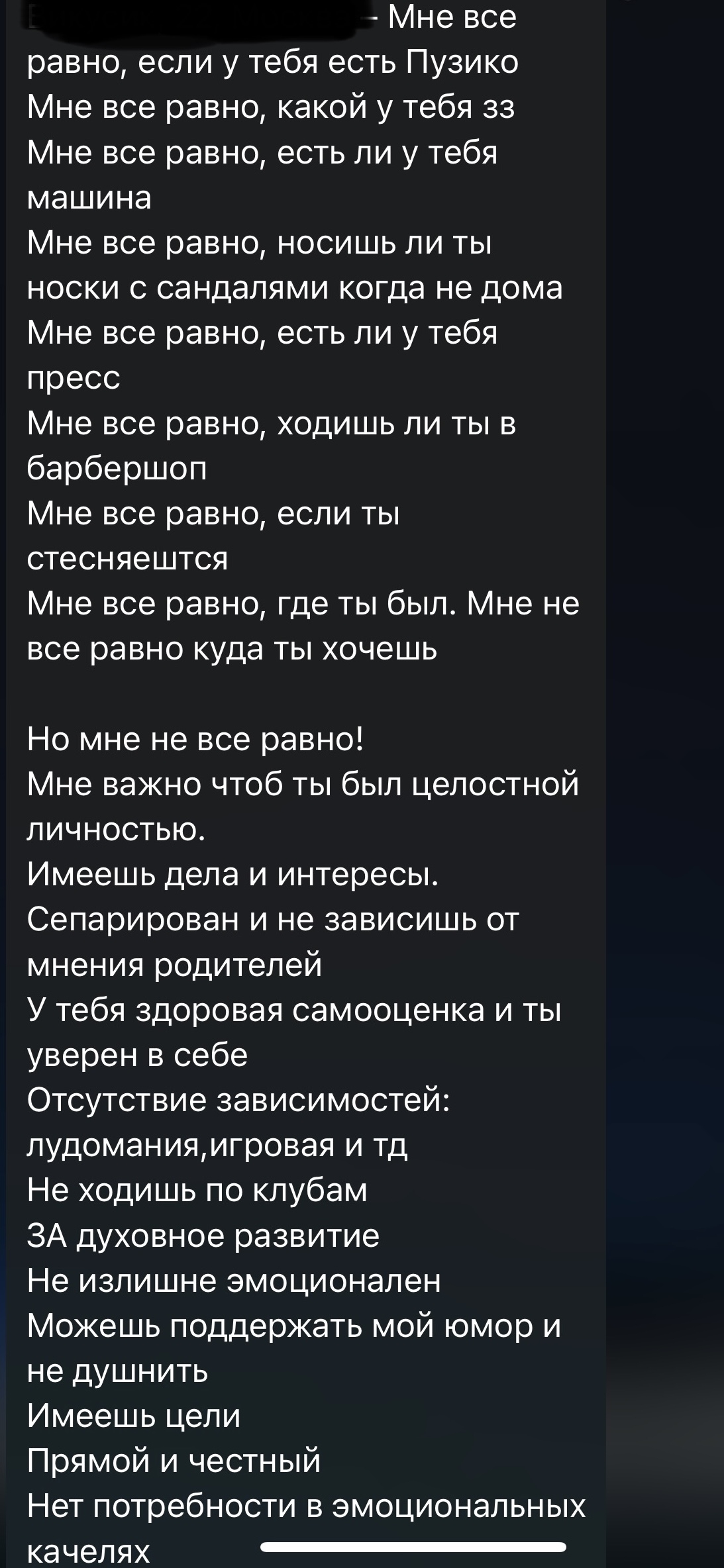 Я вот просто сижу и читаю анкеты, для кого они пишут? Основная масса мужчин уже давно как понимает и знает про супер-меркантильных баб тарелочниц, в моем случае я сразу скипаю анкету, видно что в голове говно какое то. Даже если она считает себя какой то не ебаться юмористкой, то это не отменяет тот факт, что такая хуйня в анкете отталкивает. Разве нет?