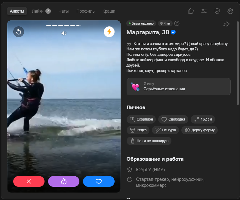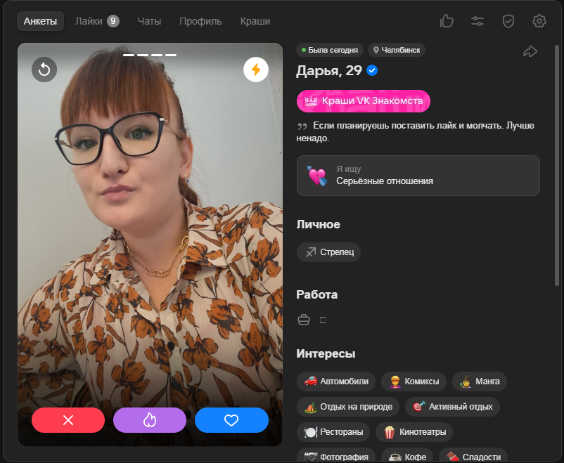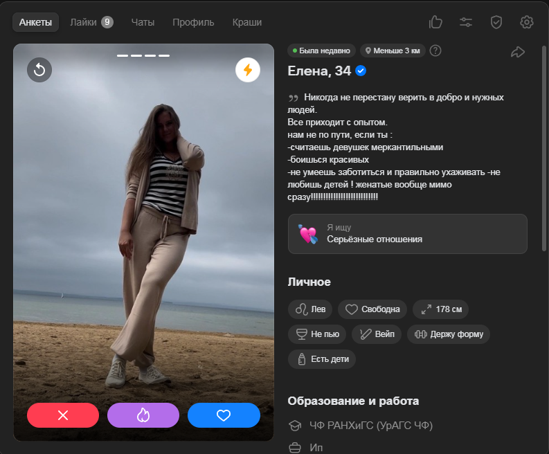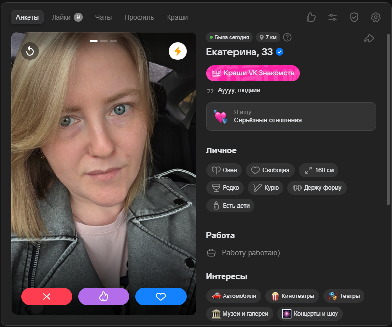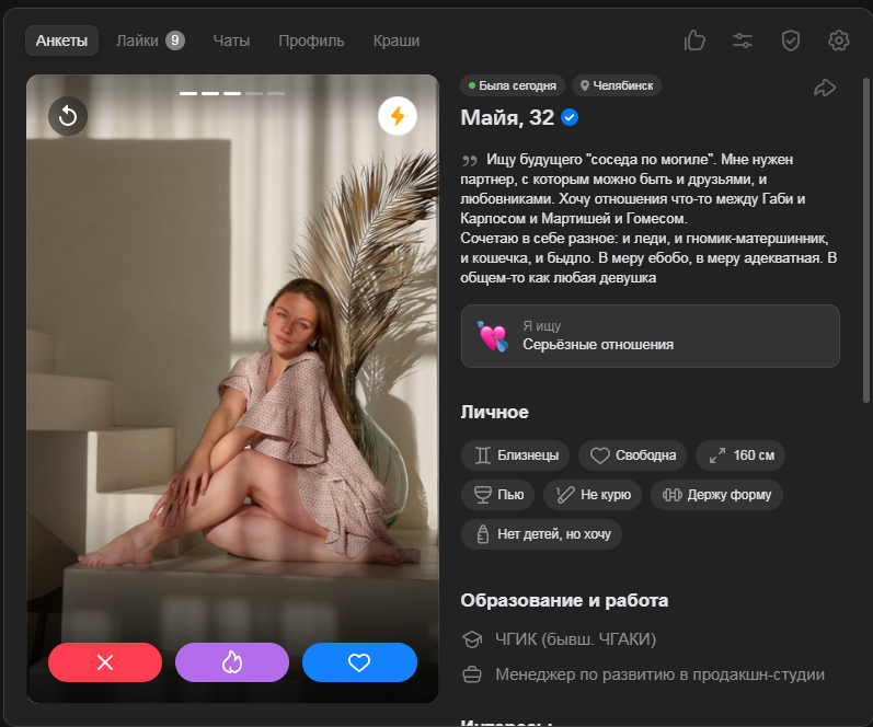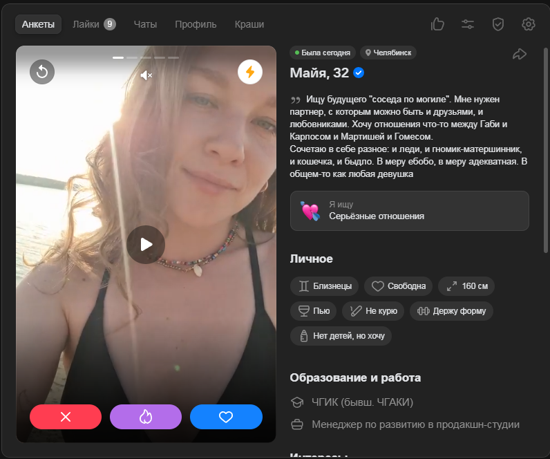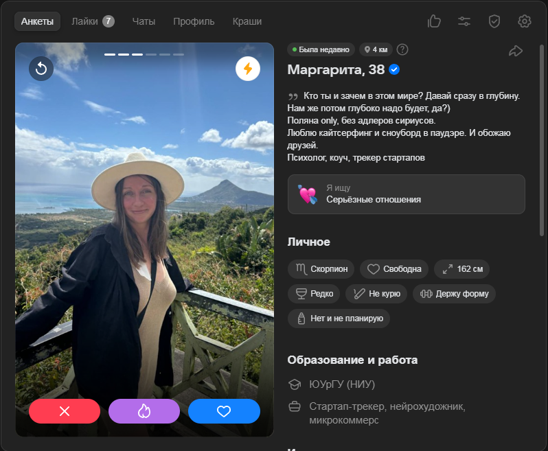 Я вот просто сижу и читаю анкеты, для кого они пишут? Основная масса мужчин уже давно как понимает и знает про супер-меркантильных баб тарелочниц, в моем случае я сразу скипаю анкету, видно что в голове говно какое то. Даже если она считает себя какой то не ебаться юмористкой, то это не отменяет тот факт, что такая хуйня в анкете отталкивает. Разве нет?