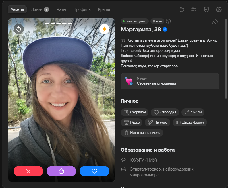 >>10306958 Какая же Жиза, пиздец. Сразу фото делай. Я ещё жирухам или страшилам с кем случайно метч и писать вытаскивать не хочу, пишу что случайно лайкнул Жалобы похоже работают потому что пару раз видел, спустя три дня тот же профиль с теми же фото но без инсты описания