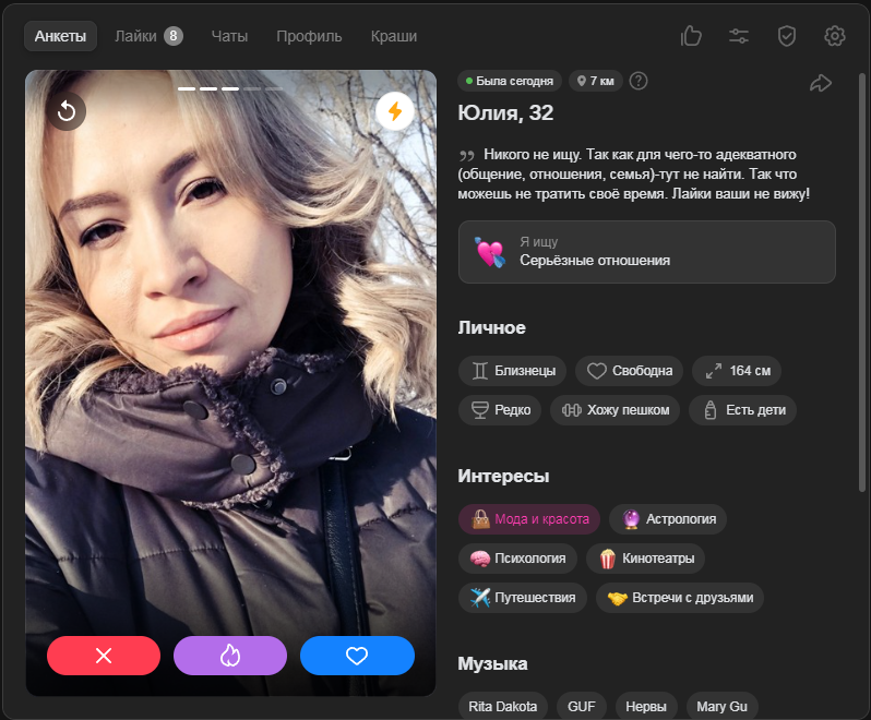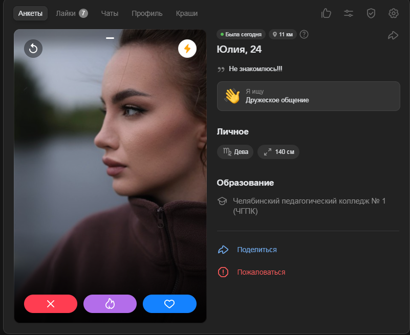 Живу в городе 100к,ПодДС.Скачал пьюр,оплатил на неделю подписку.В ленте половина ебальников из других приложух:мамба,табор и т.д.Большинство уже по именам знаю,глядя на одну фотографию.8 взаимок за сутки.Все ищут СИРЬЙОЗНЫИ АТНАШЕНИЯ.Сука,вы создали анкету на сайте для СЕКСА,блять.Заебали.Нахуя вы лезете своими еблами в Пьюр?Сидите на таборах и мамбах