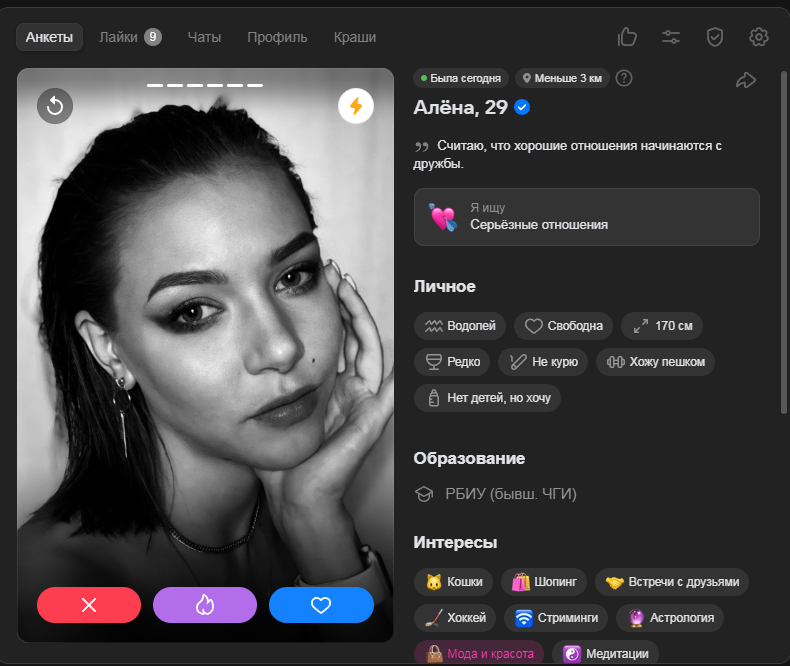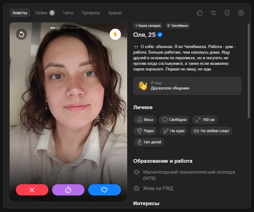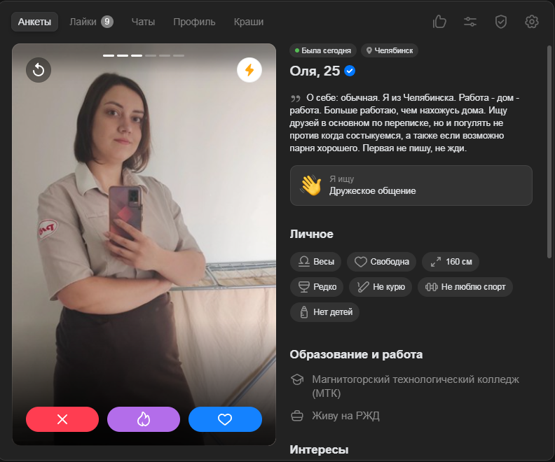 Ну это как бы база треда для среднекунов, да. Нужно подзаебаться над текстом анкеты и фотками, чтобы пошёл хоть какой-то клёв от тянок одного с тобой уровня. Но вытянуть среднетянку всё же реально. Никакого блекпилла.